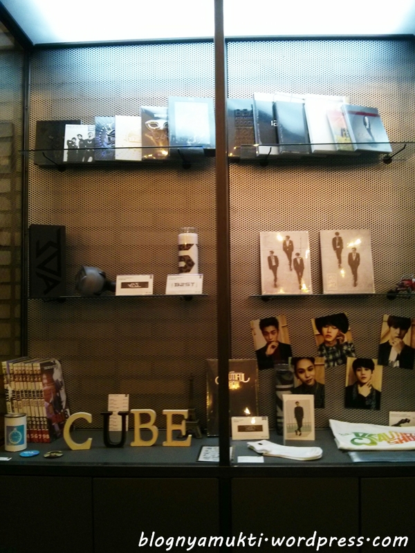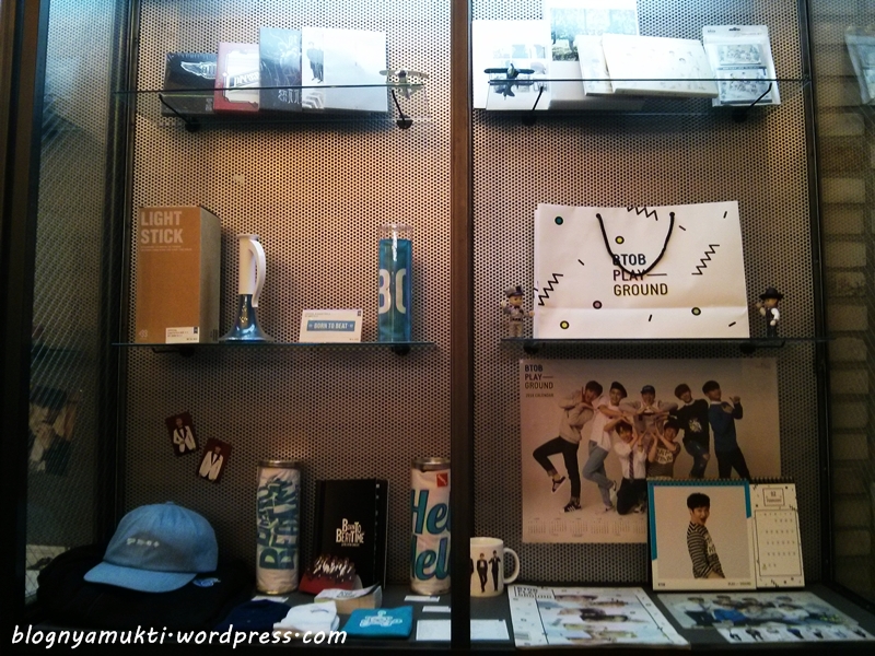 Anddd I visited the cafe today~ The new cafe is much bigger than the old one. And on one side, it plays big size video using projector. Sometimes it plays Cube artists’ MV, but not when I came there. Just like the old one, It also has Cube artists’ merchandise display. But there’s only BEAST & BTOB stuff now.
