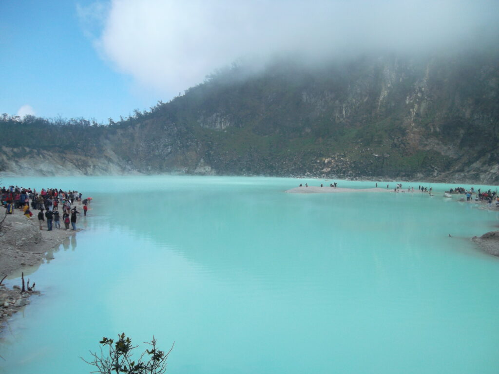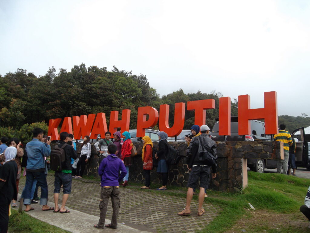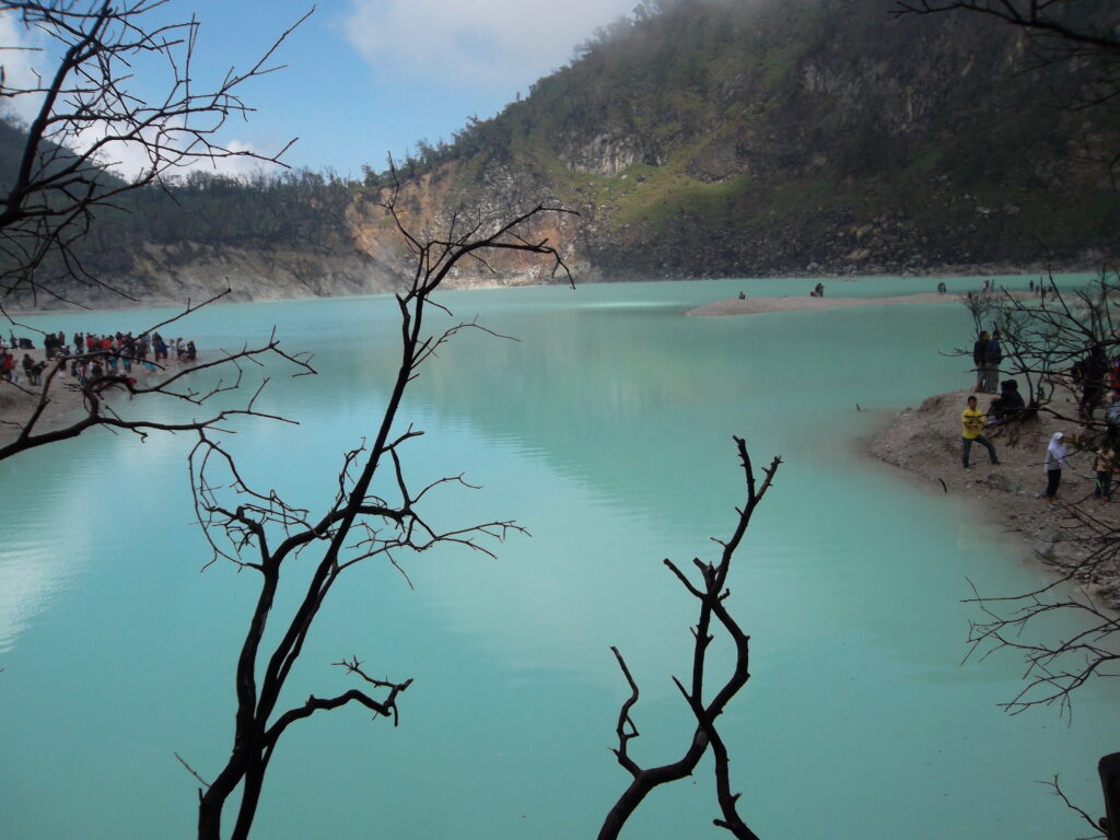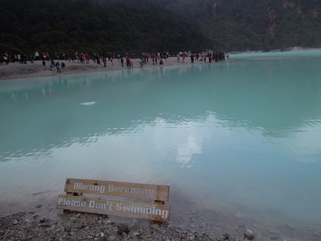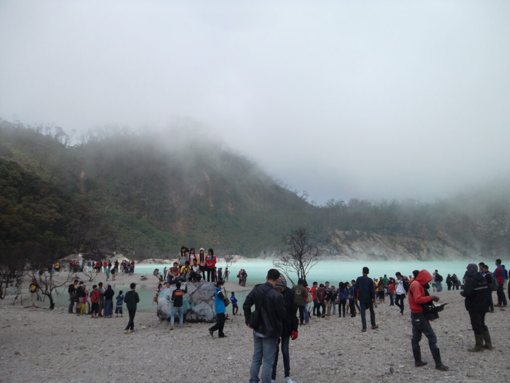 Sampai di atas, kami langsung mengikuti jalan menuju kawah putih. Wahh, beneran keren ternyata. Dan walaupun masih pagi, kawah putih saat itu sangat ramai. Kami pun berkeliling dan foto-foto disana. Sambil memperhatikan orang-orang, kami menemukan mbak-mbak yang posenya “eksotis” gitu pas foto di dekat pohon. Ampun lah mbak, model ANTM kalah sama mbak.