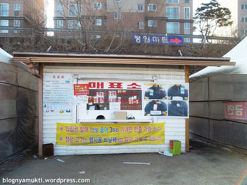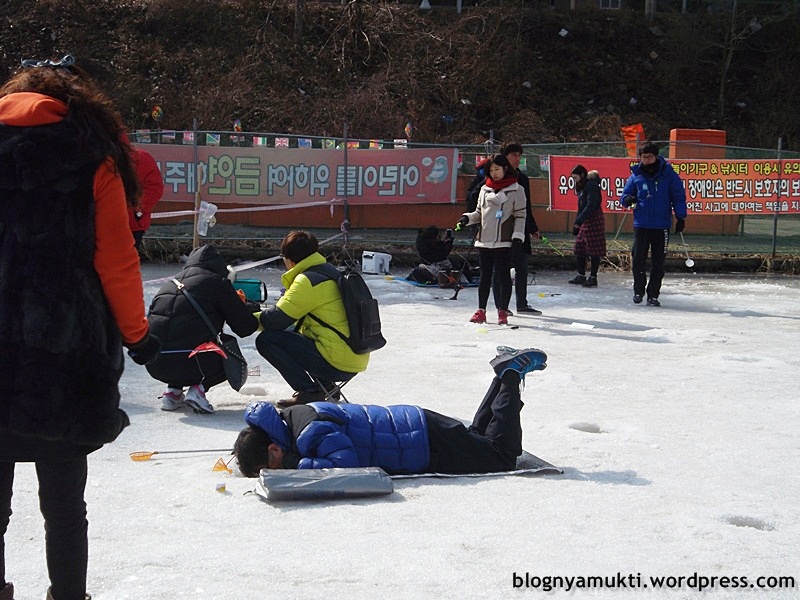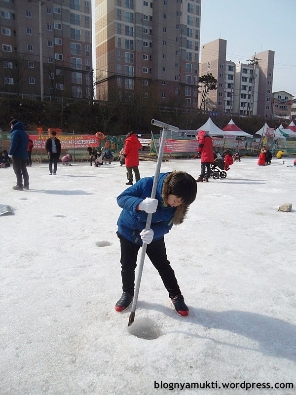 The festival is only 5 minutes from the station. There are 2 kinds of ice fishing available there, trout (์ก์ด๋์) or smelt fishing (๋น์ด๋์). I chose the smelt fishing because it’s a little bit cheaper (10000 KRW). I was kinda confused after buying the ticket because I know I need some fishing tools but I don’t know which one I should buy. I tried to ask the ticket operator but she didn’t understand. So I just walked to the area, and it turned out that they lend the fishing tools. When I showed my ticket, the operator asked me “Alone? 1 Person?”. Ugh, I hate this question. A lot!