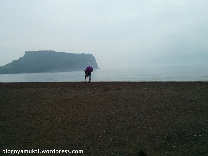 Sayangnya pagi itu hujan lagi. Waktu saya sampai di pantai, suasananya gloomy banget. Ombaknya lagi agak gede. Pengunjungnya juga sepi banget. Jadinya saya cuma sebentar banget disana. Oh iya, lokasi Gwangchigi Beach ini nggak jauh dari Seongsan Ilchulbong. Jadi kita bisa liat Seongsan Ilchulbong dari pantai ini.