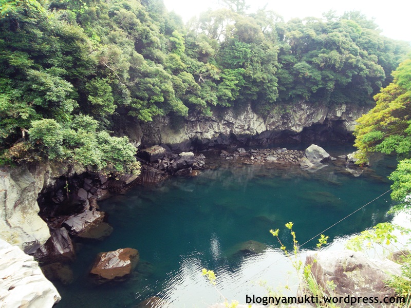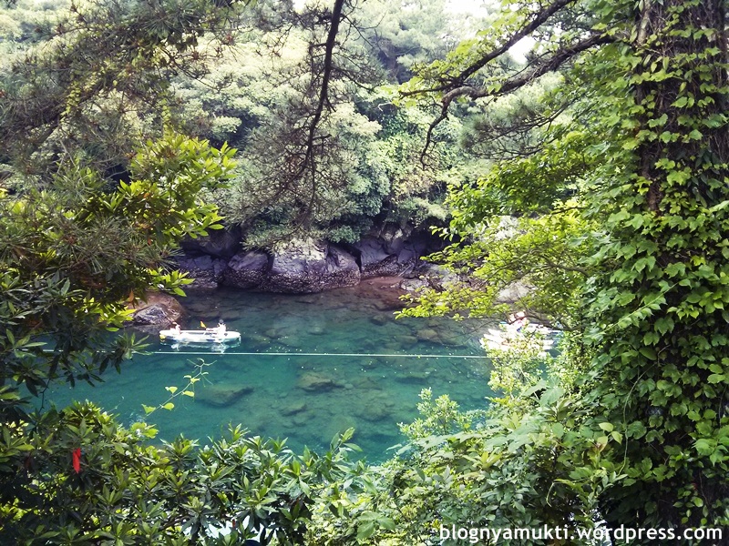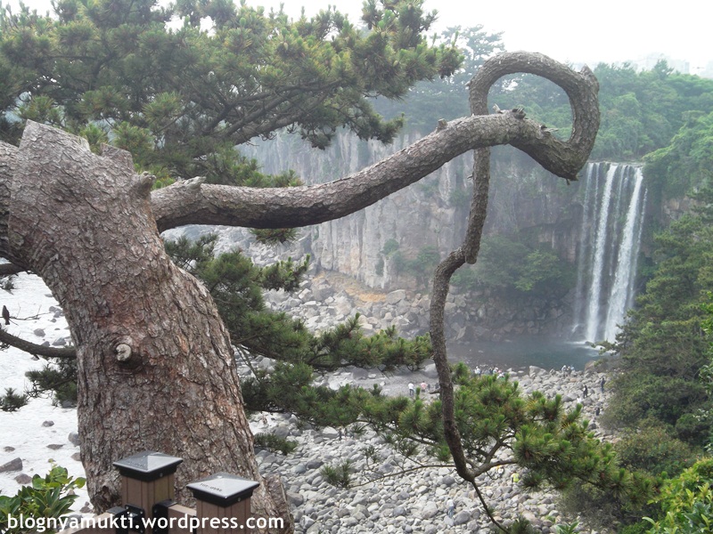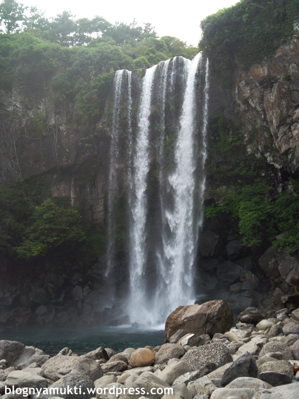 Untungnya di Jeongbang Waterfall ada locker gratis, jadi saya bisa naro bawaan saya dan dengan bebas menikmati pemandangan air terjunnya. Minta aja kuncinya sama petugas tiket. Nah, Jeongbang Waterfall ini adalah satu-satunya air terjun di Asia yang airnya jatuh di laut. Tingginya sekitar 23m dan lebarnya 8m. Sebenernya nggak ke laut langsung juga sih. Kayak ada cerukan di pinggir laut. Disini banyak batu-batu kali besar. Jadi hati-hati, apalagi kalau abis ujan. Licin. Di Jeju bagian selatan sebenernya ada 2 air terjun lagi, Cheonjiyeon dan Cheonjeyeon. Sayangnya nggak sempet kesana.