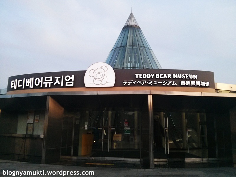 Dari Jeongbang Waterfall saya ke penginapan untuk malam itu di daerah Seogwi-dong. Namanya Namguk Hotel. Pas booking lewat booking.com, saya pilih female dorm dengan harga 17000 KRW per malam. Eh pas dateng ternyata saya dapet kamar untuk saya sendiri. Isinya 2 single bed tapi satunya kosong. Ada tv juga di kamarnya. Haha. Kamarnya agak keliatan tua sih, tapi nggak masalah. Setelah istirahat beberapa lama, saya pun panik buru-buru berangkat ke Teddy Bear Museum. Soalnya penjualan tiket cuma buka sampe jam 7 malem sedangkan kalo pake bis, untuk kesana butuh waktu sekitar 1 jam dan bisa nggak kekejer. Setelah lari-lari ke bus stop terdekat, ujung-ujungnya saya pun naik taksi kesana. Haha. Pokoknya hari itu saya berkali-kali naek taksi. Untungnya di naver ataupun daum map udah keliatan biaya taksi kira-kira berapa.