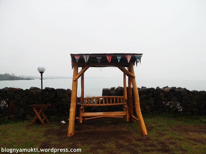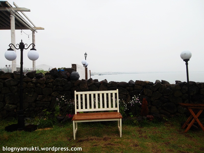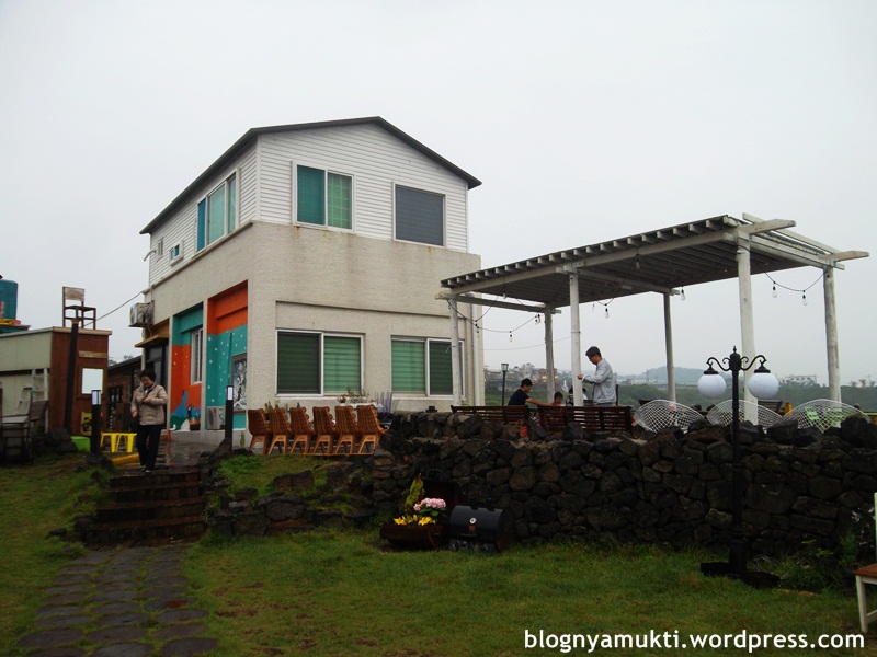 Lokasinya pas banget sebelah pantai. Gara-gara muncul di drama, kafe ini jadi makin tenar. Pas saya kesana banyak yang antre gitu. Yang jaga pun tanya ke saya butuh kursi buat berapa orang. Setelah saya jawab kalo cuma 1, dia sempet nyuruh saya nunggu. Tapi untungnya nggak lama. Yeayy. Disana saya pesen vanilla latte & cheese cake yang kalo ditotal harganya 10000 KRW. Padahal saya nggak seberapa doyan kopi dan kalo diajak ke coffee shop pun saya selalu pesen smoothie. Wkwkwkw. Oh iya, sebenernya kafe ini cuma dipake bagian luarnya aja kalo di drama. Bagian dalem restoran pake drama set. Setelah menghabiskan si cheese cake dan menyerah ngabisin kopi, saya pun foto-foto bagian belakang yang ada guesthousenya juga. Tadinya saya pengen nginep disini, sayangnya lagi nggak buka karena masih dipake syuting dan mau renovasi. Huhuhu.