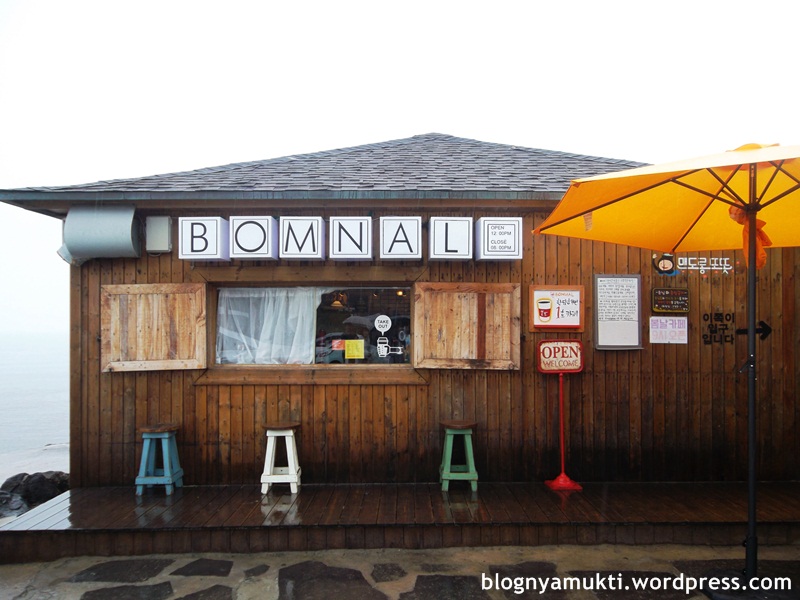 Hari keempat Ini adalah hari terakhir. Hiks hiks. Sekitar jam 7 saya sudah meninggalkan hotel. Dan lagi-lagi hujan. Rencana saya hari ini adalah mengunjungi Jeju bagian barat yang nggak keburu saya eksplor di hari pertama. Jadi rute saya selama di jeju ini thawaf 1 puteran. Kkkk. Tempat yang pertama kali saya kunjungi adalah Bomnal Cafe! Kafe ini muncul di Warm & Cozy sebagai restoran 맨도롱 또똣 tempatnya Gunwoo & Jungjoo.