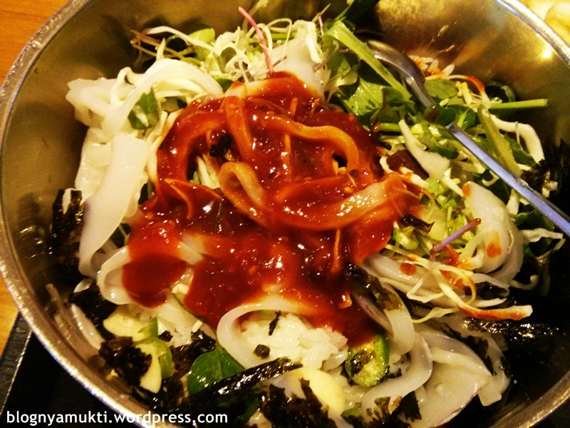 Ini dia tampilannya sebelum diaduk: nasi + irisan selada + timun + kecambah + irisan ikan mentah + gochujang + gim.