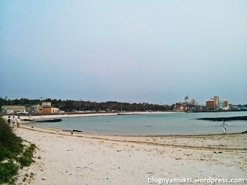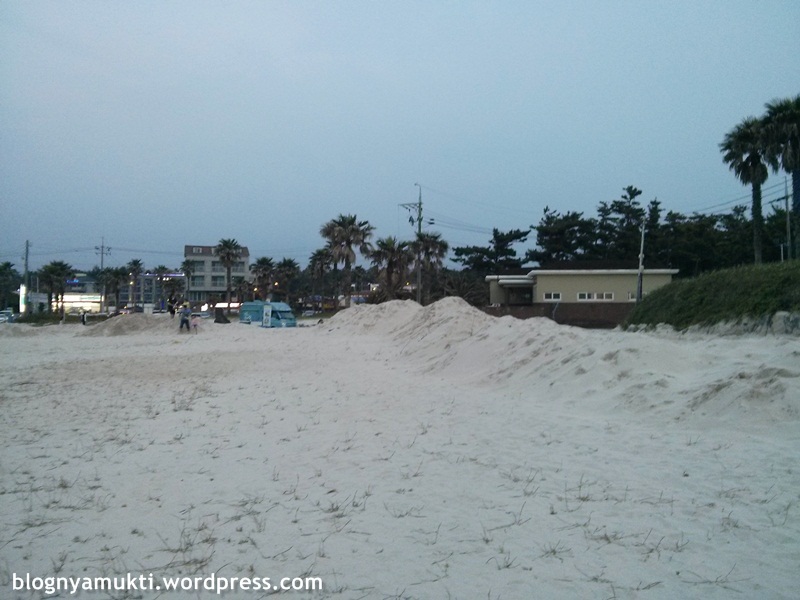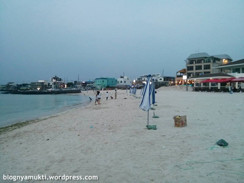 Saya jalan menyusuri pantai ini sampai ketemu lagi pantai lainnya: Hyeopjae Beach (협재해변). Hyeopjae ternyata lebih rame daripada Geumneung Euddeum. Ada anak-anak kecil yang asik berenang. Ada yang lagi pre-wedding. Ada juga yang cuma duduk-duduk pacaran. Pemandangan di Geumneung Euddem lebih oke dari Hyeopjae sih menurut saya. Cuma Hyeopjae lebih ramah pengunjung, fasilitasnya lebih lengkap. Ada penyewaan ban, area main pasir buat anak-anak, dan restoran juga. Ini hampir jam 8 malem.