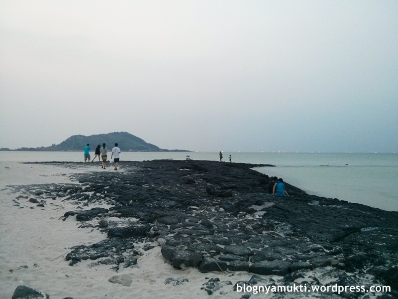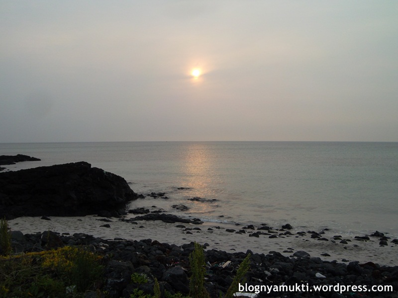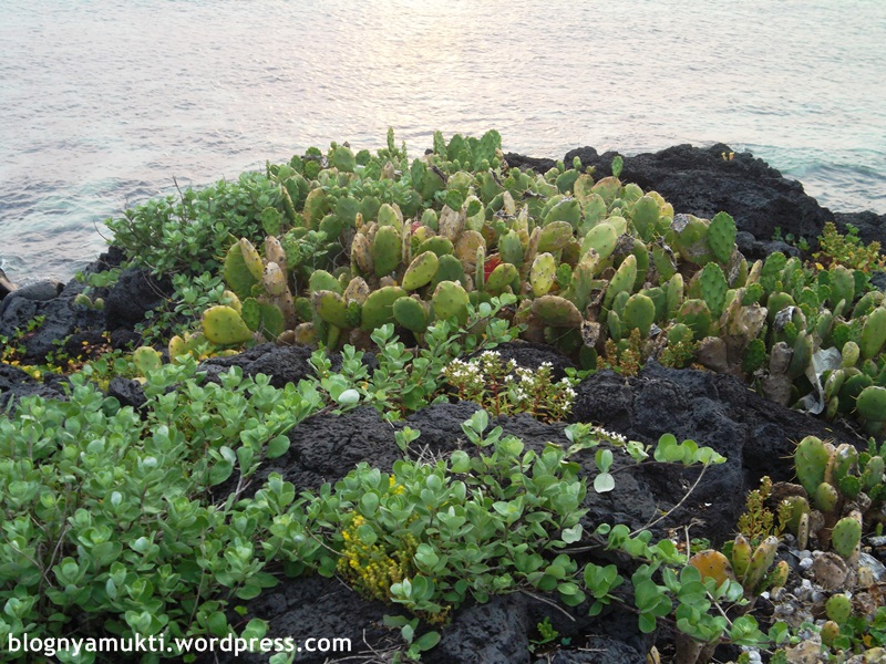 Pantai + batu + kaktus yang tumbuh di sekitaran batu + jembatan kayu + matahari yang mulai terbenam. Cakep!