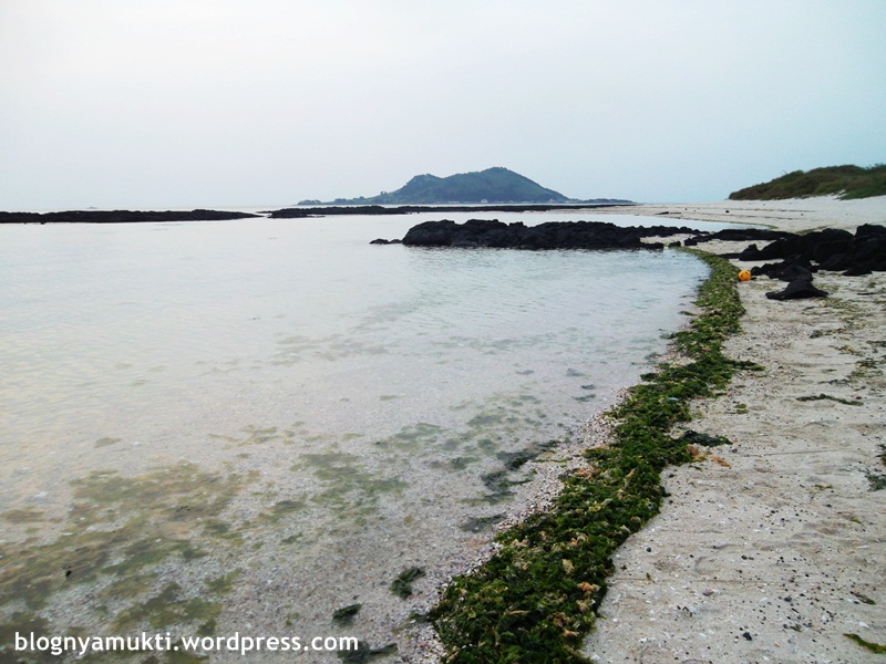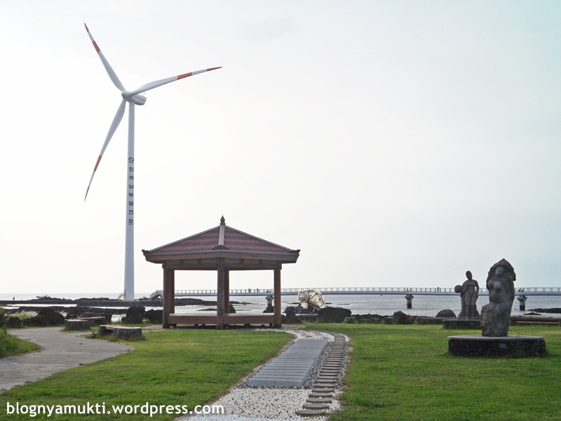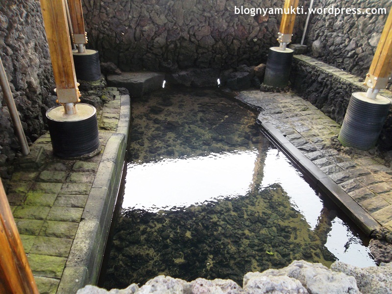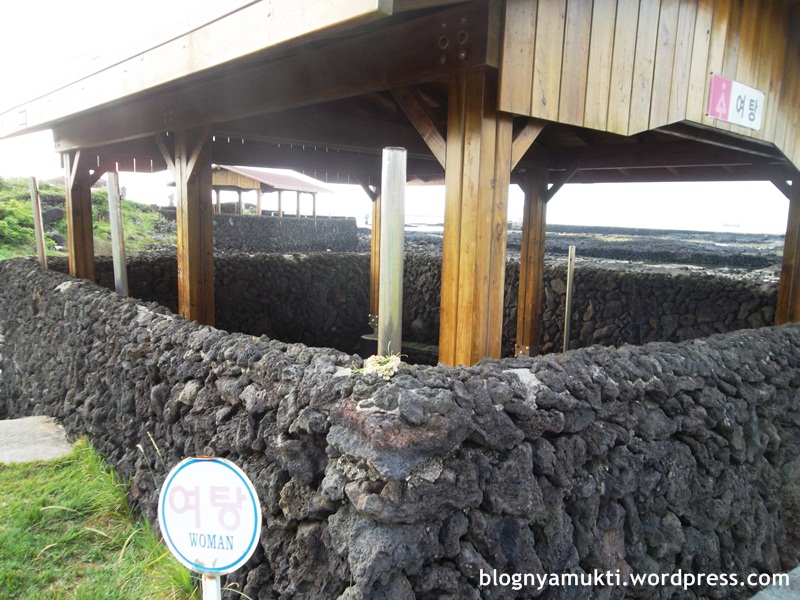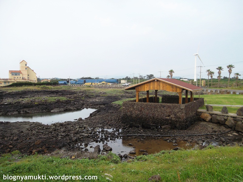 Di dekat windmill farm, terdapat pemandian yang disebut Shingaemul. Ada 2 pemandian, masing-masing untuk pria dan wanita yang dibatasi dengan pagar batu khas Jeju. Airnya berasal dari laut, tapi saat saya coba pegang walaupun ada bau asin ternyata airnya nggak amis dan lengket.