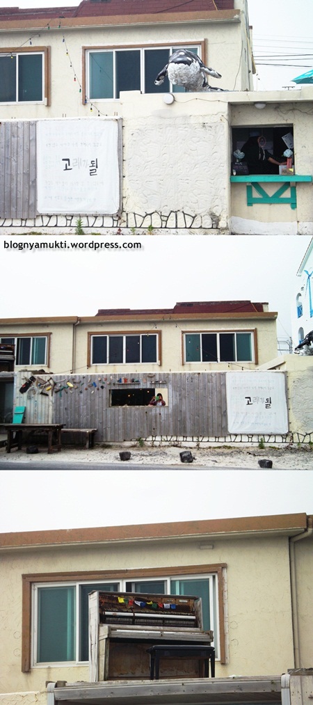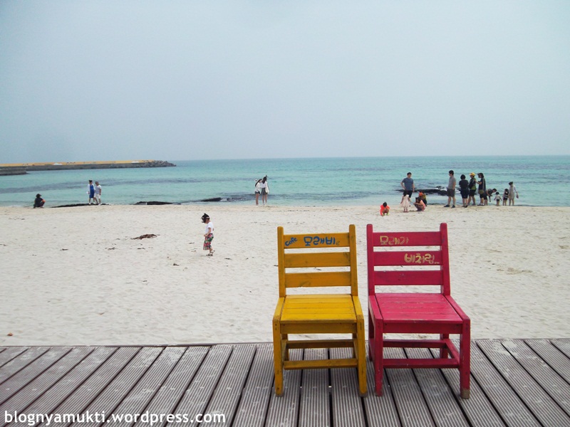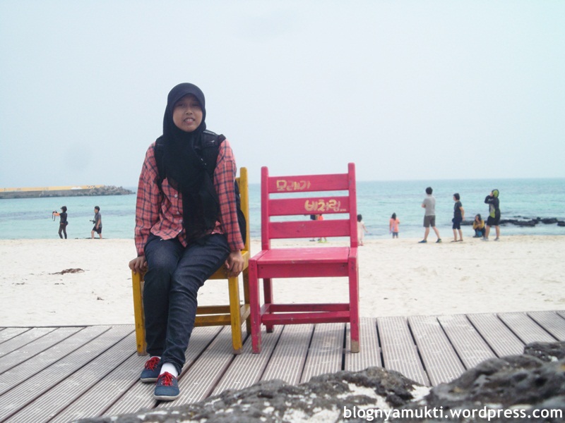 Di sekitar Woljeongri Beach banyak kafe-kafe lucu.Salah satunya Moraebi. Mereka menyediakan kursi warna warni gitu di deket pantai. Dan akhirnya kursi ini jadi objek foto favorit pengunjung. Hahaha. Saya belagak ikutan foto pake timer. Tapi berkali-kali nyoba timingnya nggak pas juga dan akhirnya nyerah. Wkwkwk.