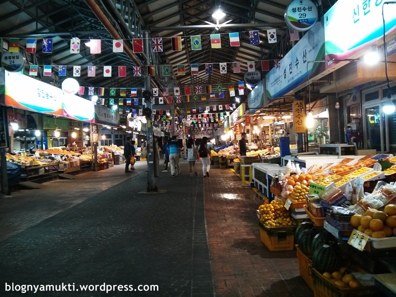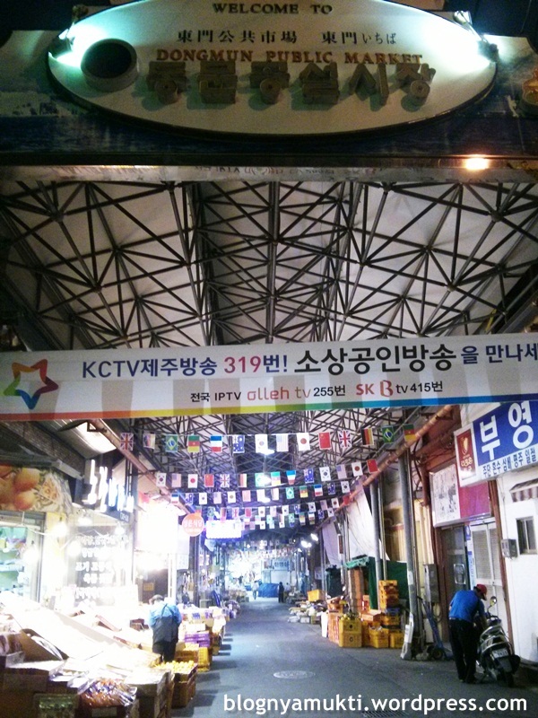 Dari Seongsan Ilchulbong, saya memutuskan untuk kembali ke penginapan. Saat jalan dari bus stop ke penginapan, saya melewati Dongmoon Market. Saya pun penasaran masuk kesana. Ternyata banyak yang jual oleh-oleh khas jeju disini. Saya akhirnya beli cokelat dan crunch khas Jeju seharga 10000 KRW/6 kotak. Lumayan murah meriah. Dan enak pula. Penjualnya ngasih sample waktu saya tanya crunch itu apa. Ternyata crunch itu snack beras yang dikasih rasa macem-macem. Ada rasa hallabong (jeruk khas jeju), kaktus jeju, green tea, blueberry, dll. Kalo di Indonesia, mirip jipang. Cuma yang di jeju bentuknya bukan panjang-panjang kayak bentuk beras asli, tapi bulet-bulet.