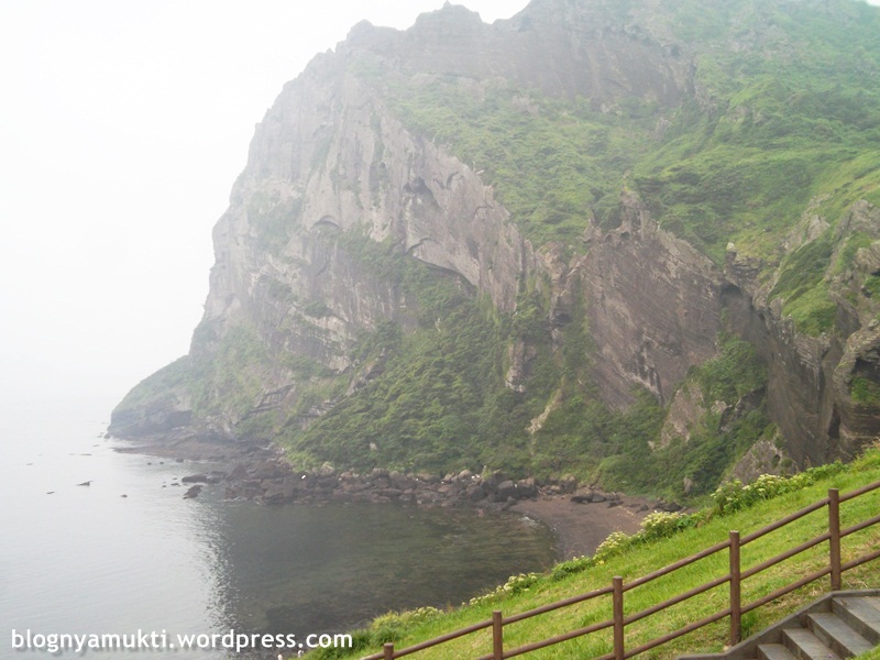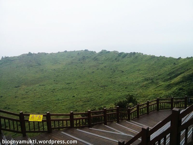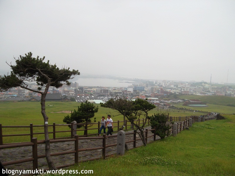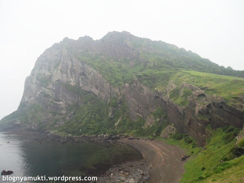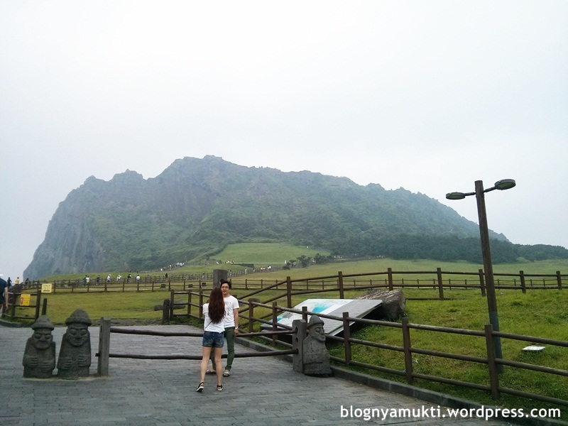 Sesampainya di Seongsan Harbour, saya kembali ke bus stop dan menuju tujuan selanjutnya: Seongsan Ilchulbong (Seongsan Sunrise Peak). Seongsan Ilchulbong merupakan puncak yang terbentuk dari ledakan gunung berapi bawah laut 100.000 tahun yang lalu. Kawahnya memiliki diameter 600m dan tinggi 90m. Bentuknya menyerupain mahkota raksasa. Katanya sunrise view dari kawahnya ini keren banget. Makanya banyak yang pengen liat. Jam bukanya 1 jam sebelum matahari terbit. Saya sempet pengen liat juga sih, tapi karena penginapan saya lumayan jauh dari sini dan pas saya tanya temen saya gimana cara kesana pagi-pagi buta, dia nyaranin naek call taxi akhirnya saya nyerah. Selain mahal, saya juga nggak yakin bisa bangun pagi-pagi banget. Hahaha. Oh iya, Seongsan Ilchulbong ini adalah salah satu UNESCO World Heritage dan juga World New7Wonders of Nature.
