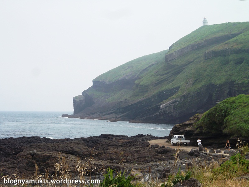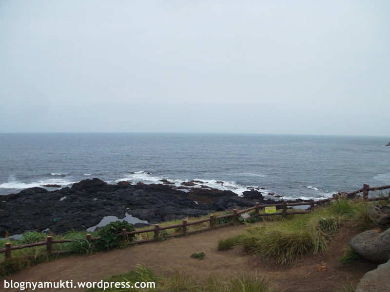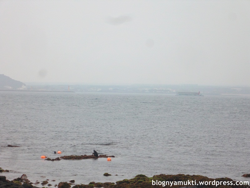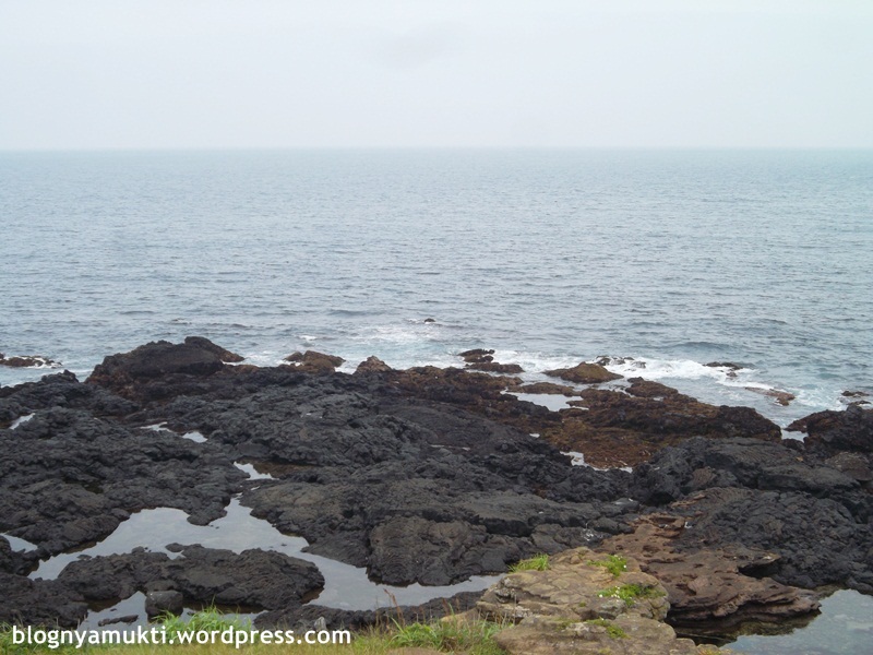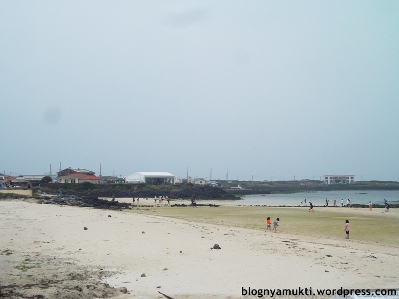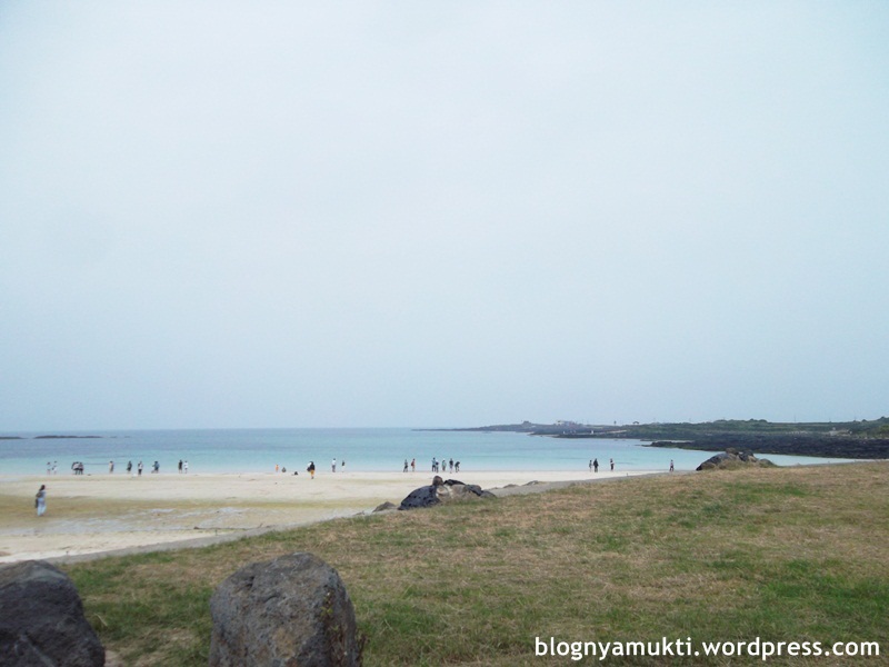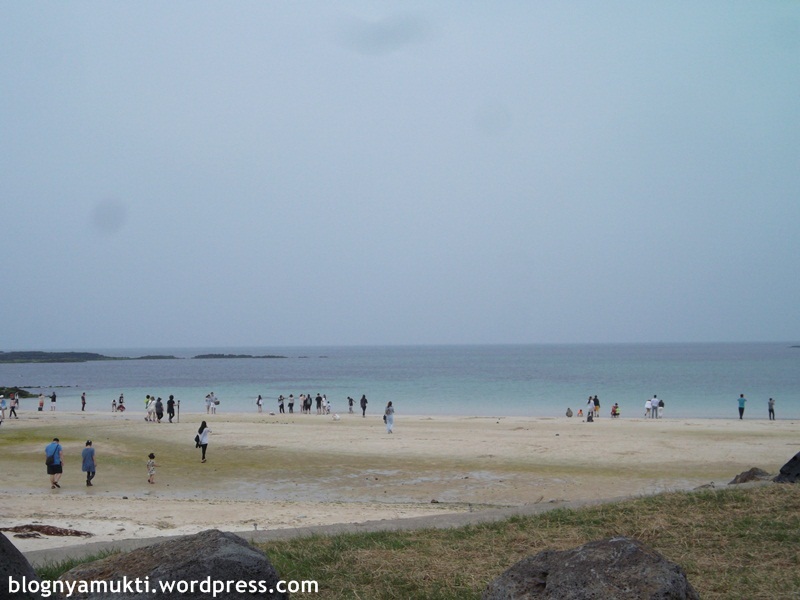 Pas keluar, eh ternyata hujan… Haduhh. Tadinya tempat pertama yang ingin saya kunjungi adalah Manjanggul Cave. Tapi ditunggu sejam lebih, bis yang menuju Manjanggul Cave kok nggak dateng juga. Akhirnya saya mengubah rencana dan langsung ke Woljeongri Beach dengan bis lain. Saya kesini berdasarkan rekomendasi temen saya yang orang Korea. Dia bilang wajib banget ke pantai ini. Kan saya jadi penasaran. Mendekati pemberhentian bis untuk ke Woljeongri Beach, saya baru sadar ternyata bis ini juga melewati pemberhentian bis untuk ke Manjanggul Cave. Jengjengjeng. Tapi melihat jam saat itu dan masih banyak tujuan lain di hari itu, saya pun tetap nggak jadi ke Manjanggul Cave. Nggak mungkin cuma sebentar sih disana, minimal 1 jam. Jadi pass dulu.