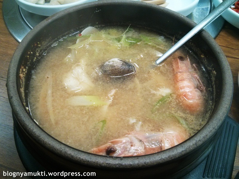 Setelah dari pasar, saya pun cari restoran di dekat penginapan dan akhirnya nemu yang menarik. Saya pesan 해물 뚝배기 (seafood hotpot). Harganya 8000 KRW. Dan pas banchan-nya mulai dikeluarin, saya pun cukup shock. Banyak banget dan itu merupakan banchan termewah yang pernah saya dapet. Haha. Ada telur rebus full, tahu, tumis jamur, kimchi, dan 1 lagi entah apa tapi enak rasanya mirip asinan kedondong. Selain itu porsi seafood hotpotnya pun besar banget. Isinya ada kepiting, udang, dan kerang. Enakkk. Yang punya juga ramah. Ngeliat saya yang kayaknya kecapekan dan kepanasan, dia nawarin kipas anginnya diidupin. Tentu saja dengan senang hati saya terima tawarannya. xD