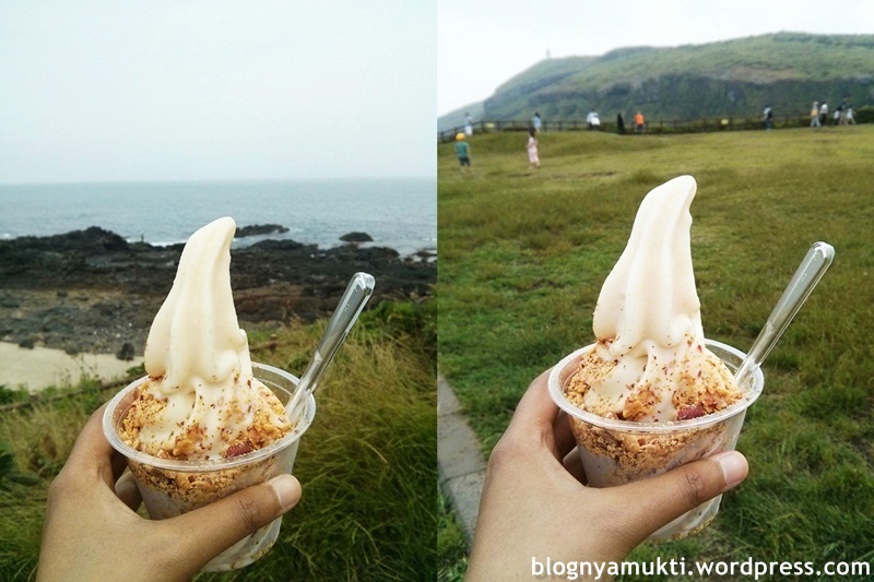 Setelah jalan lumayan jauh, akhirnya sampe juga di deket Udo Peak. Viewnya cakep banget. Ada lighthouse juga di atasnya. Saya nggak naek ke puncaknya sih. Di deket situ, ada penyewaan speed boat/jetski. Agak serem juga liatnya. Disini saya beli es krim kacang khas udo. Es krimnya rasa jeruk, trus dikasih taburan kacang gitu. Harganya 5000 KRW buat 1 cup kecil. Mahalll. Tapi lumayan enak sih. Haha.