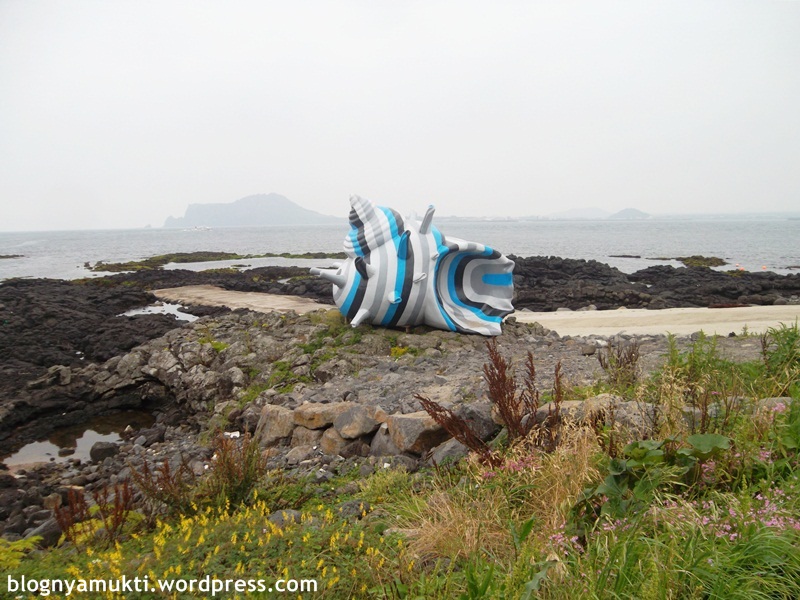 Baru jalan sedikit, saya liat ada batu yang disusun seperti piramid-piramid kecil dan patung kerang besar. Saya pun berhenti untuk foto-foto. Eh ternyata di dekat situ banyak haenyeo. Saya pun asyik memperhatikan mereka bekerja. Ini adalah pengalaman pertama melihat haenyeo secara langsung. \o/ Nggak apa-apa nggak jadi ke Haenyeo Museum xD
