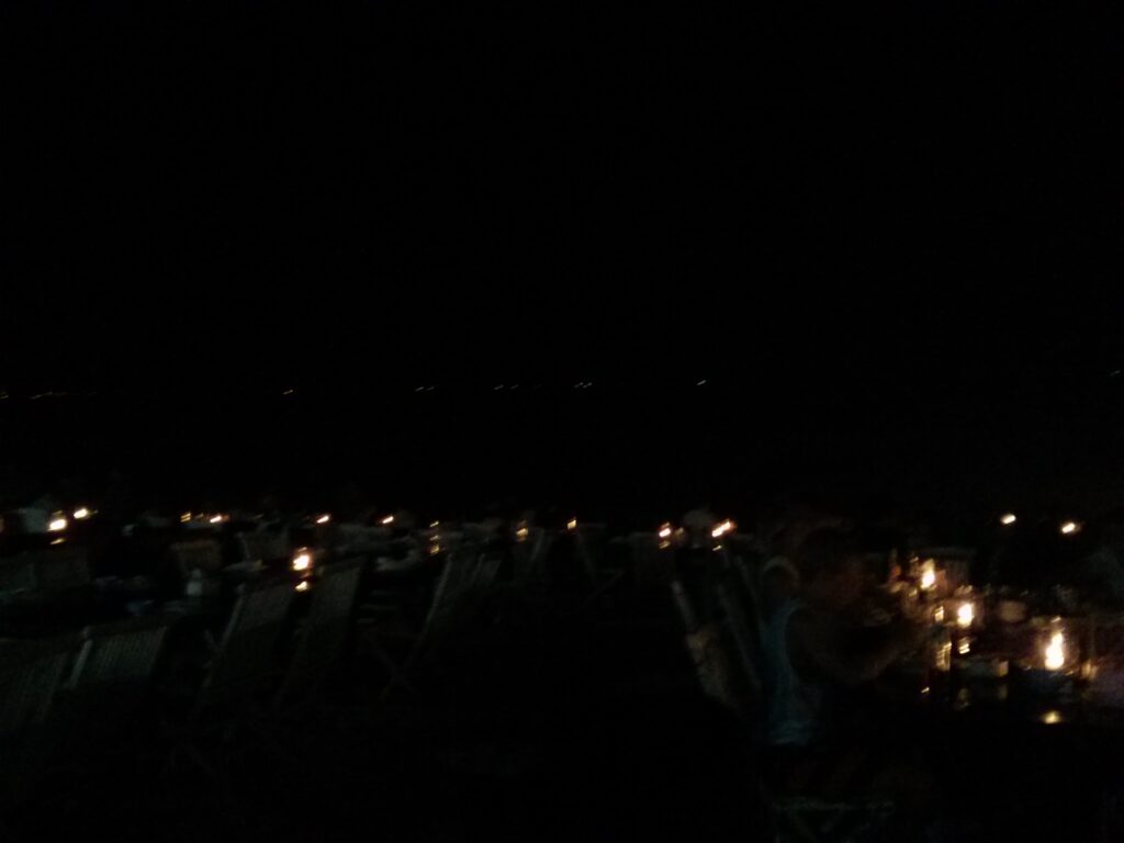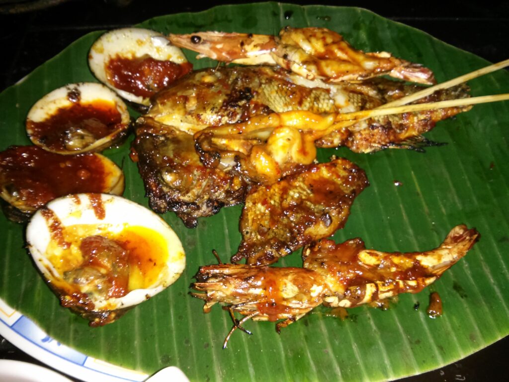 Agenda selanjutnya adalah makan malam. Kami sudah membeli voucher makan di restoran daerah jimbaran dari groupon. Yup lagi-lagi groupon, hehe. Sampai di tempatnya, kami memilih duduk di dekat pantai. Tapi karena malam, percuma saja pantainya nggak terlihat sama sekali. Oh iya, ternyata restoran yang kami datangi tepat bersebelahan dengan Kafe Nyoman yang pernah dibom tahun 2005. Sesuai yang tertera di groupon, makanan yang kami pesan adalah paket seafood yang terdiri dari ikan, kerang, udang, sate cumi, dan sayuran. Setelah menunggu lumayan lama, akhirnya makanan datang juga. Kerangnya favorit saya deh, bumbunya enakkk banget. Udangnya juga besar. Dapat sambal matah juga, karena saya suka bawang jadi saya suka banget sambal matah ini. Kalau dari segi makanan, puas lah makan disini. Tapi sabar aja kalo sebelahan dengan rombongan yang berisikk banget. xD