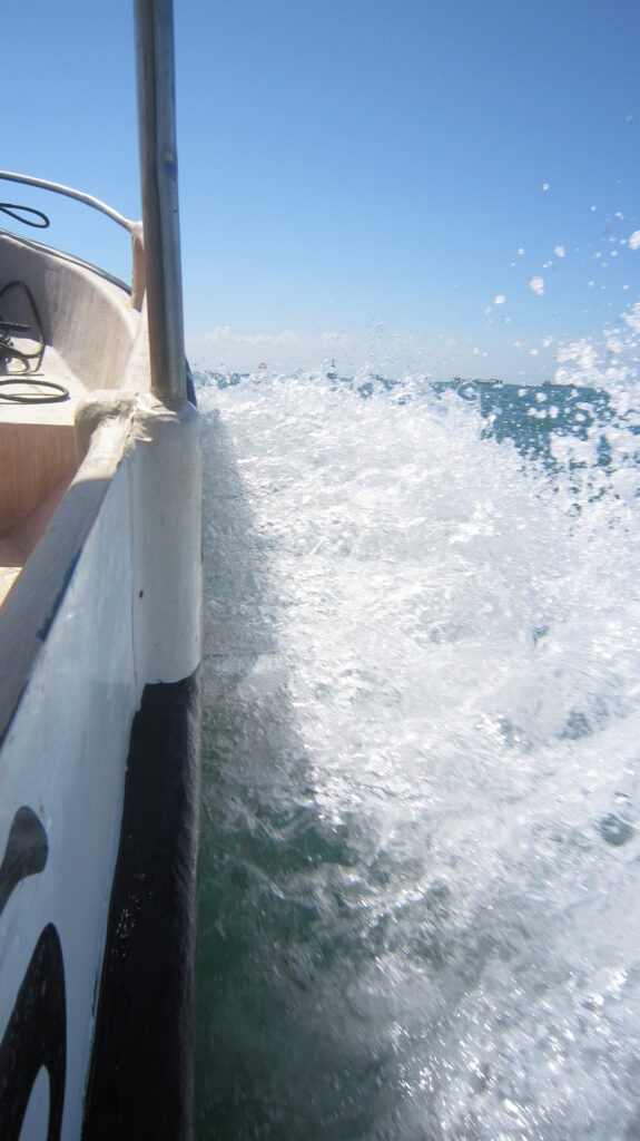 Tadinya mau donut boat dulu, tapi karena antreannya rame kami pun ditawari snorkeling duluan. Yasudah kami pun ikut aja. Dikasih fin, goggles, dan roti buat ngasih makan ikan. Dikasih tau cara pakenya juga. Kami kemudian dibawa ke pantai, nunggu kapal yang akan membawa kami ke area snorkel. Akhirnya kapalnya datang. Menuju area snorkel, ombaknya cukup besar. Beberapa kali kapal seperti menabrak ombak. Saya pun nanya ke bapak yang nyetir kapal, apakah di tempat snorkel ombaknya gini juga. Dan beliaupun menjawab iya. Degg. Nasib awak.