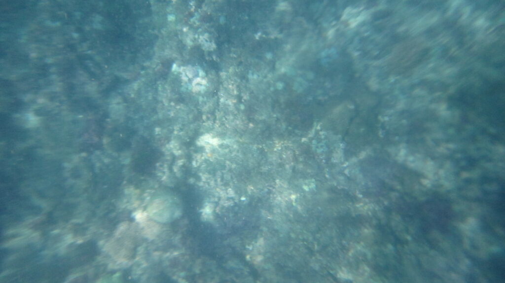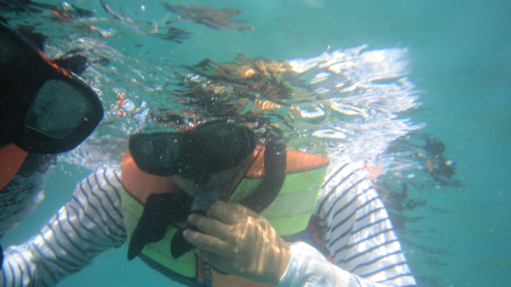 Entah setelah berapa lama, sampailah kami di area snorkeling. Supaya turunnya lebih gampang, dikasih tangga. Begitu turun ke air, saya kelabakan. Muter-muter nggak jelas. Bapak supir kapal pun ngebantu ngebenerin goggles saya. Ampunlah saya cupu. Wkwkwk. Sayangnya di tempat ini nggak terlihat apa-apa. Batu-batuannya sedikit. Ikannya juga. Bahkan setelah saya tabur roti juga nggak ada ikan yang mendekat. Ditambah lagi, karena kecupuan saya entah berapa kali saya meminum air laut. Sampai akhirnya saya nggak kuat lagi, mual banget rasanya. Saya mengajak iponk untuk menyudahi sesi snorkel. Saya melambai-lambai ke arah kapal tanda menyerah. Dan begitu sampai di kapal, keluarlah itu angin lewat mulut. Hghhhh. Wanita macam apa. Huahaha. Bodo amat diliat bapak kapal, abisnya udah nggak enak banget perutnya. Kami pun kembali ke sisi pantai.
