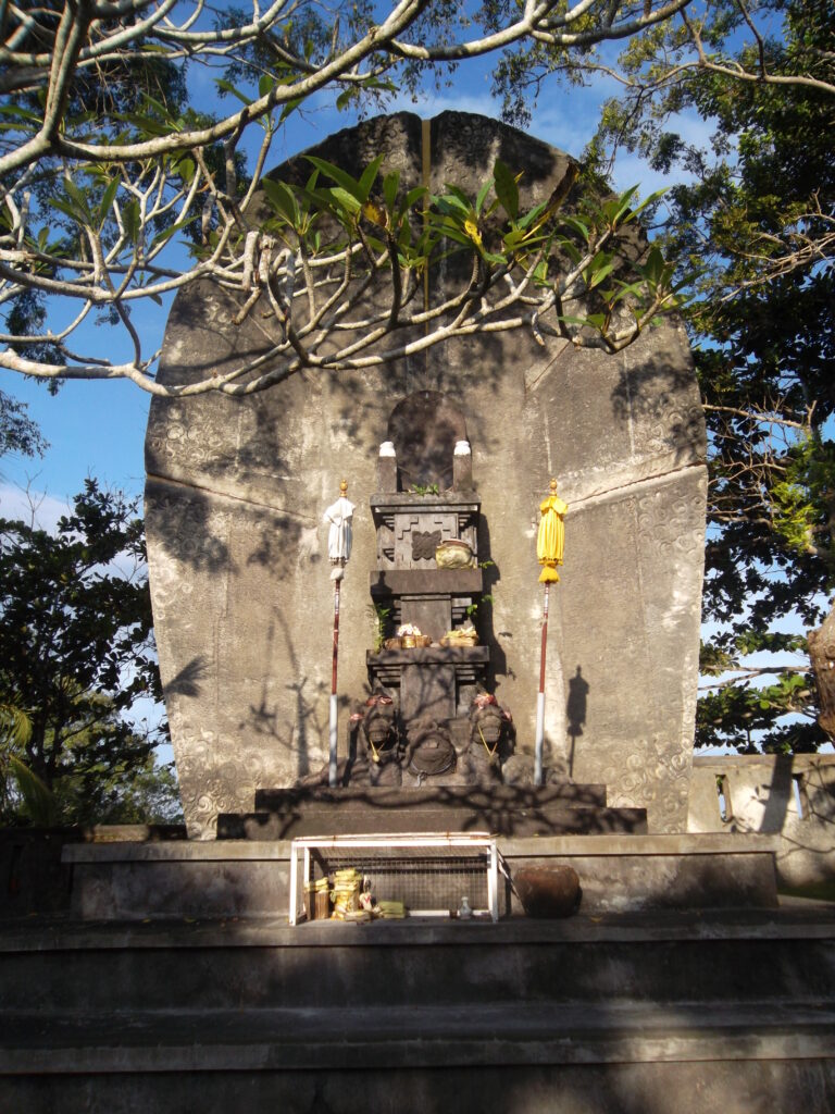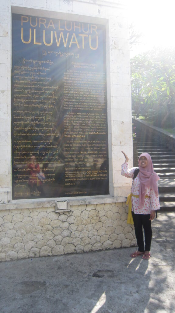 Puas di pantai pandawa, kami kemudian meluncur ke uluwatu. Jalannya lumayan sepi dan naik turun. Saat melewati salah satu jalan, di samping kami ada kuburan. Ulan dan vita pun membahas kalau di desa adat itu mayatnya tidak di-aben tetapi dikubur. Ini nih enaknya jalan sama orang lokal, bisa dapet cerita-cerita begini. Hehe. Sampai di uluwatu, kami langsung ke loket tiket. Di depan, ada yang mengikatkan kain ke pinggang. Karena saya pakai celana panjang, kain yang diikatkan ke saya adalah ikat pinggang saja. Kalau pakai bawahan pendek, kain yang diikatkan adalah kain panjang yang menutupi kaki. Di loket tiket itu juga ada penjual pisang. Saya sempat ditawari untuk membeli pisang untuk makanan monyet. Tapi karena takut didekati monyet, saya pun menolak.