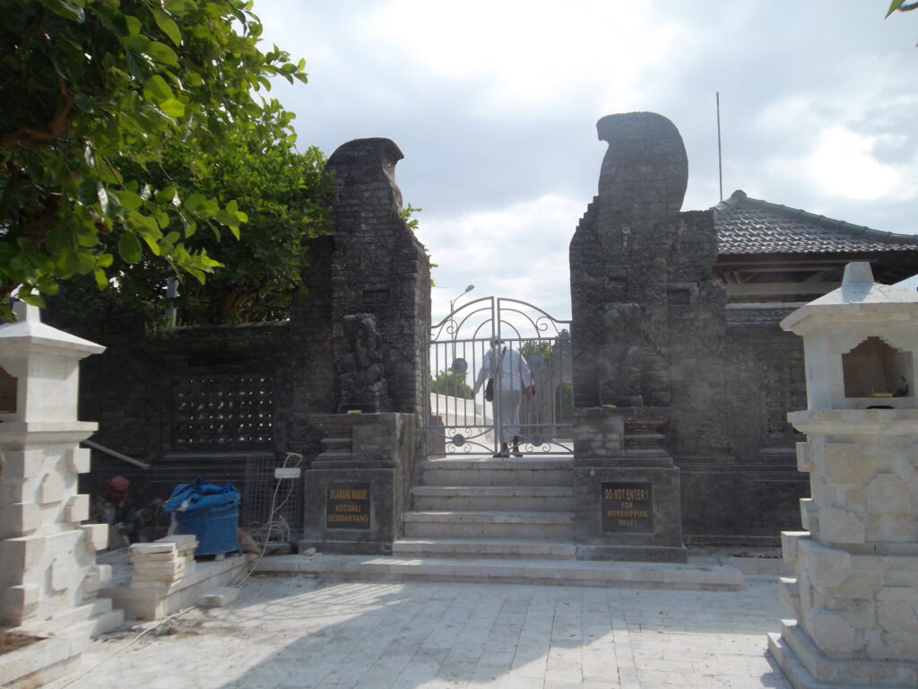 Kami kemudian naik menuju kompleks pura utama. Tapi hanya yang akan sembahyang saja yang boleh masuk pura utama, kami hanya foto-foto di sekitarnya, mengintip-intip sedikit, dan menonton kelakuan monyet-monyet gendut. Setelah itu kami pun berjalan keluar. Saat itu, kami bertemu rombongan karyawan facebook yang dengan bangganya memakai kaos “facebook got me hired”. Hahaha. *langsung jiper*