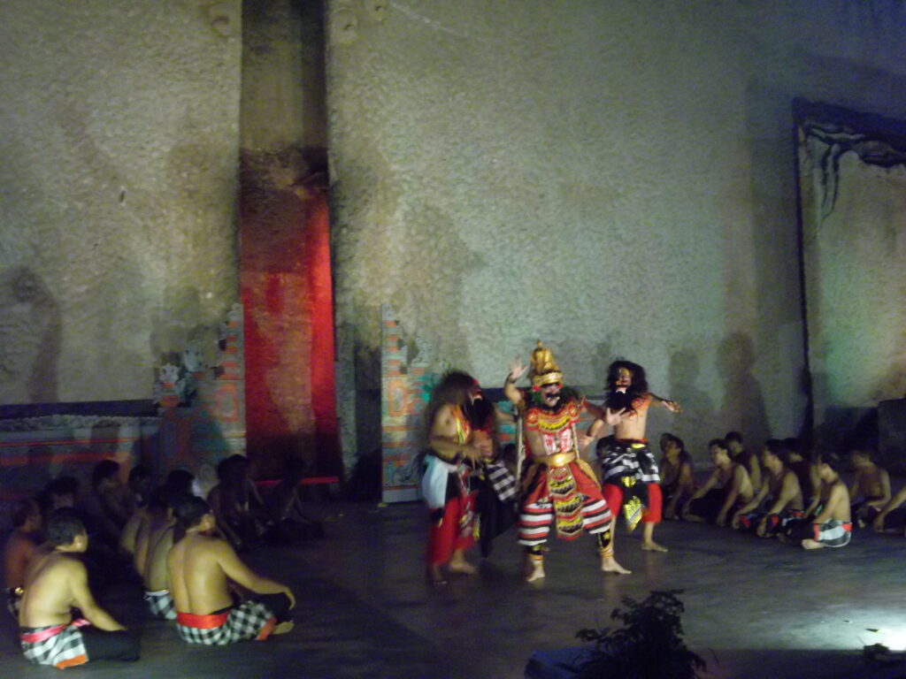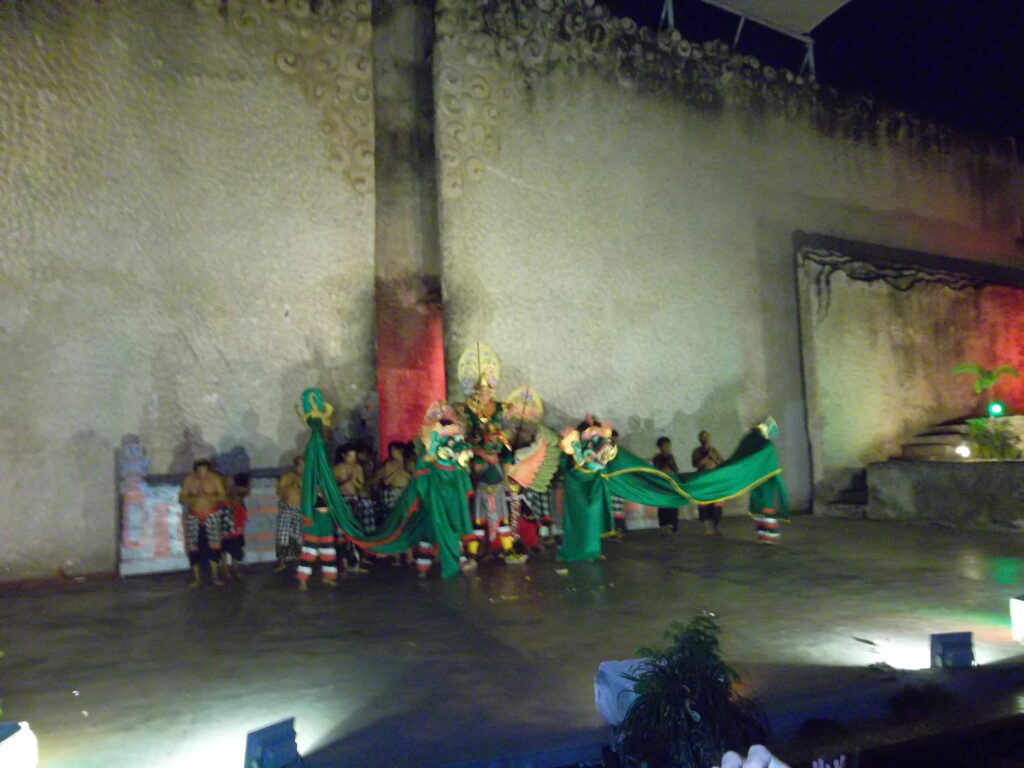 Pertunjukan tari kecak pun dimulai. Kalau tidak salah tari kecak yang ditampilkan disini sudah dimodifikasi. Untuk hari itu, ceritanya tentang garuda wisnu kencana. Di tengah-tengah tarian, si garuda ataupun makhluk-makhluk jahat kadang mendekati penonton. Area yang didekati biasanya langsung jadi heboh, hehe. Durasi pertunjukan ini kira-kira 1 jam. Secara keseluruhan, pertunjukan tarinya menghibur. Di akhir, penonton bisa berfoto dengan para penari. Tapi karena antreannya panjang, kami pun memutuskan untuk tidak ikut berfoto. Apalagi kami sudah berfoto dengan mbak penari dari pertunjukan sebelumnya. ๐