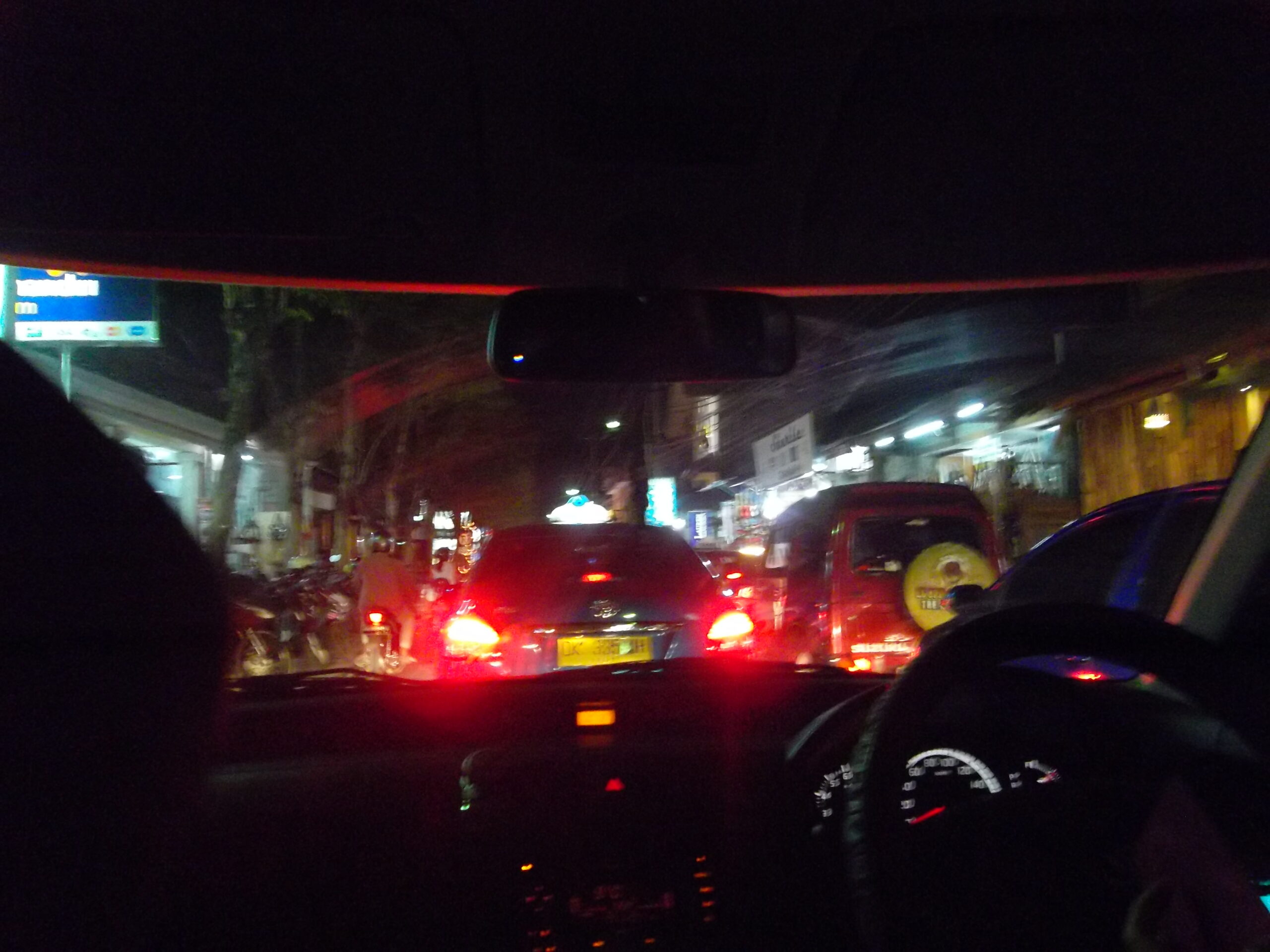 Perjalanan dari bandung ke bali memakan waktu kurang lebih 1 jam 40 menit. Saya mendarat di bandara Ngurah Rai sekitar pukul 17.45 waktu setempat. Langsung keluar terus nelpon iponk. Karena lagi nggak terlalu jauh dari bandara, iponk pun bilang bakal ngejemput saya. Cari spot buat nunggu deh. Selama jalan, banyak sopir taksi pake seragam yang nawarin. Setelah nunggu, akhirnya iponk dateng dianter vita. Vita ini temen ELF iponk. Kkkk, itulah salah satu manfaat per-kpop-an: bisa punya temen dimana aja. Nawar taksi ke legian, dapet harga 85ribu. Wew, mahal ya. Vita juga sudah wanti-wanti ke sopirnya jangan ngebawa kami mampir kemana-mana. Kan kadang ada aja supir nakal yang udah kerja sama dengan toko atau atraksi tertentu supaya dapet upah kalo bisa bawa orang kesana. Pas ke parkiran ternyata mobilnya bukan sedan kayak taksi biasanya, tapi sejenis avanza gitu. Dan itu katanya taksi resmi bandara, baiklah.