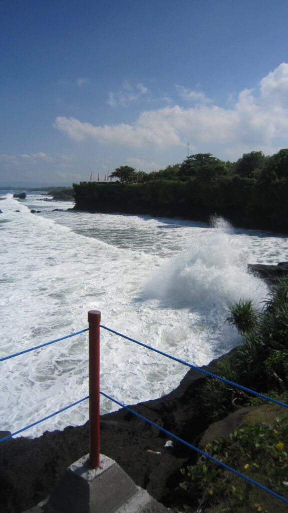 Selesai sarapan kami langsung berangkat ke Tanah Lot. Harga tiket masuk untuk wisatawan domestik, dewasa 10000, anak-anak 7500. Kalau wisatawan asing, dewasa 30000, anak-anak 15000. Dari gerbang utama ke pura, kami berjalan melewati deretan toko souvenir. Tapi kami nggak membeli apa-apa disana, hehe. Sampai di komplek pura, kami berjalan ke arah pura batu bolong atau pura karang bolong. Lokasinya di ujung batu karang yang bolong di tengahnya, makanya dinamakan seperti itu. Saat kami datang, laut sedang pasang dan ombaknya besar sekali. Bahkan sesekali batu karang ikut bergetar saat ombak datang. Bikin deg-degan gimanaa gitu.
