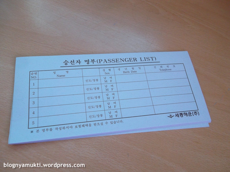 To buy the ticket, write passenger list on this form and then go to the queue. Give the form and your ID card to the staff. And after that you can just pay for the ticket. They usually ask if you bring car or not. That’s all.