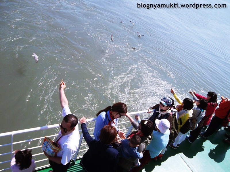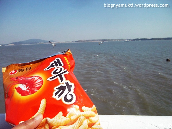 After that, I rode my bike back to Sindo Wharf and returned the bike. I bought ticket to Sammok Wharf for 2000 KRW. When I queued for ferry, an ahjussi asking where’s my bike. I think he’s the ahjussi I met in Sugi Beach. I told him I returned the bike. And he complimented me for coming there by myself even though I’m a foreigner and woman. He even said baksu (applause). 아저시, 오버하지 마세요 #digetokahjussi. On the ferry, I opened my shrimp snack that I coincidentally bought before coming to the islands without knowing about the seagulls. I fed it to the seagulls and … myself. Well, it’s tasty. Haha.