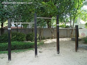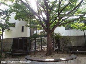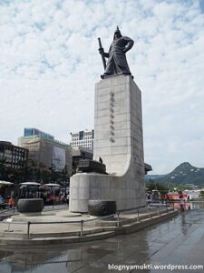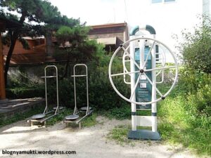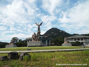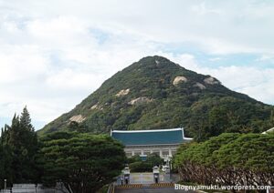 Setelah puas, saya pun keluar. Saya berjalan menuju sisi kiri istana. Di tengah jalan, saya menemukan taman kecil. Saya kemudian mampir ke taman ini dan makan bekal roti dan telor ceplok yang saya bawa. Ya, saya sengaja membawa bekal karena saya nggak tahu bakal makan dimana dan cukup susah mencari makanan yang bisa saya makan disini. Taman ini cukup kecil tapi asri. Disini juga terdapat alat olahraga yang memang sering ditemukan di taman-taman umum. Selesai makan, saya pun lanjut jalan lagi sampai menemukan patung-patung di depan sebuah museum. Nama museum ini adalah Cheongwadae Sarangchae. Museum ini merupakan museum kepresidenan korea. Rupanya di belakang Gyeongbokgung terdapat Cheongwadae (Blue House) yang merupakan istana kepresidenan. Pantas saja pengamanan di jalan yang saya lewati tadi cukup ketat. Saya sempat ditanya akan kemana oleh seorang polisi. Untuk mendapatkan foto Cheongwadae terbaik, berjalanlah ke arah gerbang belakang Gyeongbokgung. Disitu kita bisa mendapatkan foto dengan latar belakang Cheongwadae.