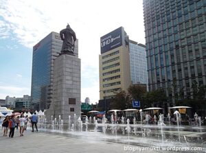 Area ini selalu ramai pengunjung. Bayangkan saja, jalan di seberang Gwanghwamun merupakan jalan 10 jalur. Tapi setiap lampu penyeberangan berwarna hijau, penyeberang akan memenuhi jalan tersebut. Di sekitar lampu penyeberangan terdapat penjual street food khas korea seperti fried sweet potato stick, dried squid, dan beondegi (larva).