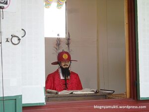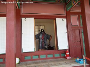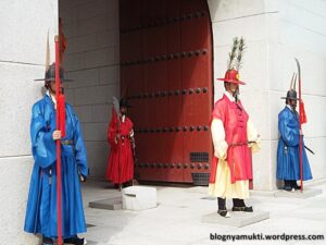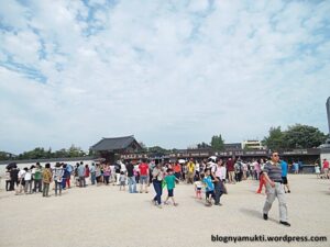 Saat saya sampai di Gyeongbokgung, pas sekali sedang ada royal guard changing ceremony. Saya pun menonton upacara ini walaupun hanya sebentar karena memang sudah mau selesai. Setelah upacara selesai, saya masuk ke dalam. Antrean tiket ramainya bukan main, saya pun mengurungkan niat untuk masuk ke dalam. Lagipula Gyeongbokgung ini luasnya luar biasa, sepertinya lebih baik kalau saya mengalokasikan waktu khusus untuk mengeksplorasi seluruh bagian istana. Di Gyeongbokgung ini kita juga bisa mencoba pakaian penjaga istana. Tapi karena pendaftaran untuk batch selanjutnya baru akan dibuka setengah jam lagi, saya pun tidak mencoba. Saya pun cuma berkeliling di area depan.