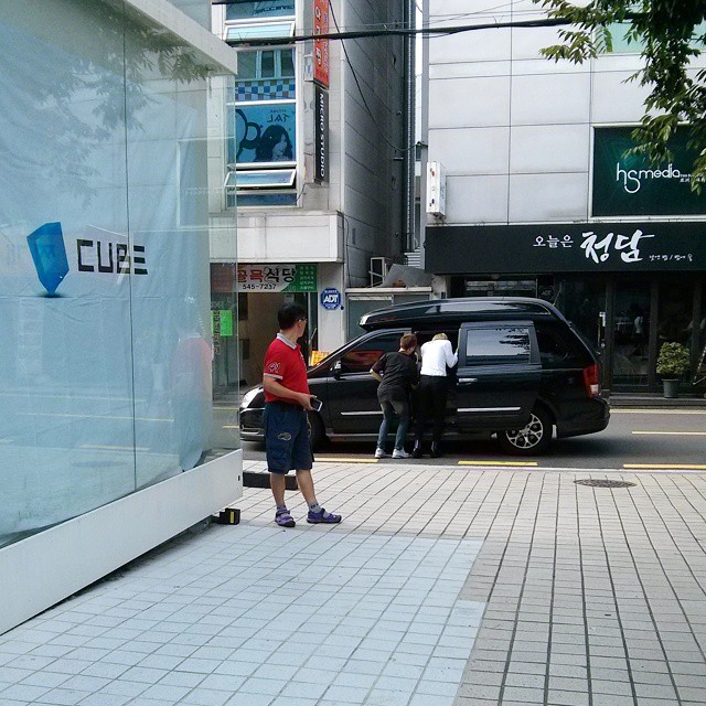 But even though it’s closed, I saw BEAST Dongwoon went out from Cube Cafe. Too bad, he closed his face with hands. I can recognize him from his height and hair color. And I also saw BTOB Changseob. He was walking to the training center which is just some buildings away and then to Cube Cafe.