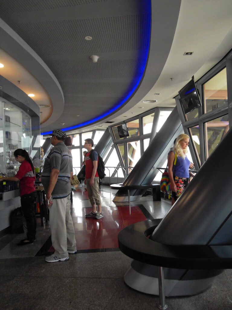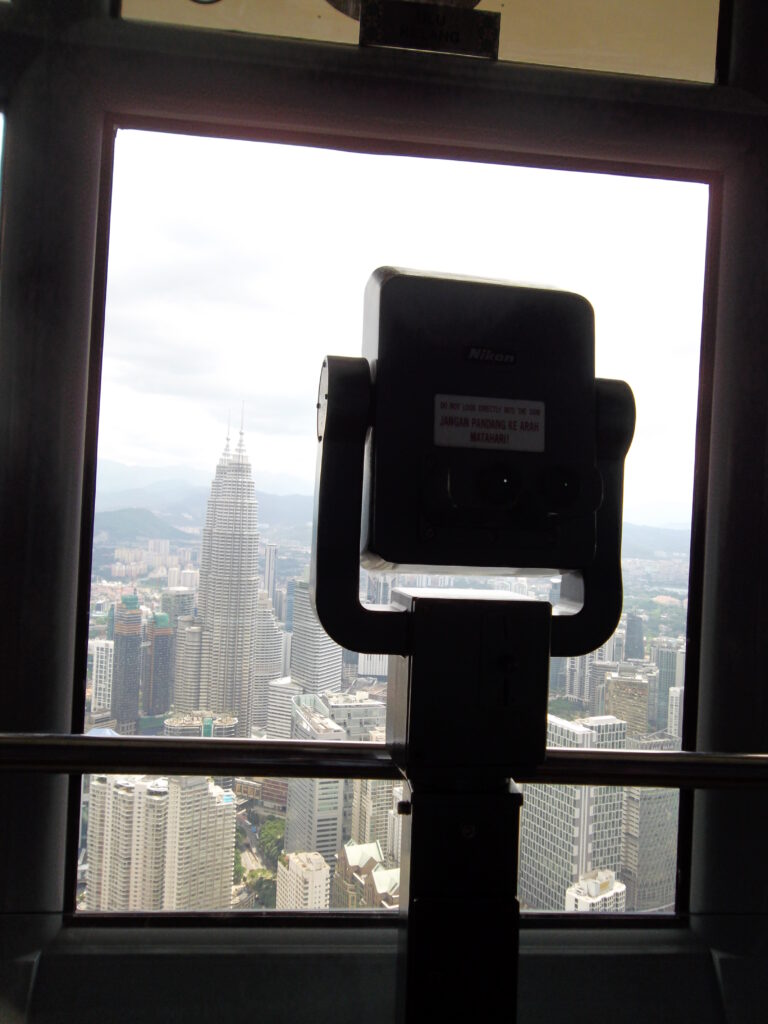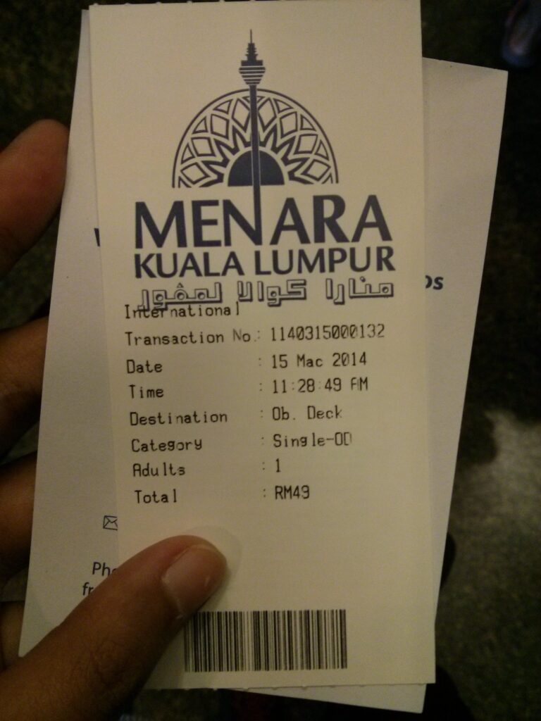 Dari Batu Caves, saya balik lagi ke KL Sentral. Disana, naik LRT lagi ke Dang Wangi station. Tujuan selanjutnya adalah Menara KL alias KL Tower. Ke KL Tower bisa turun di Dang Wangi naik LRT atau di Bukit Nanas naik monorail. Karena LRT lebih murah, makanya saya naik yang ke Dang Wangi. Jarak dari Dang Wangi ke Bukit Nanas nggak terlalu jauh kok. Dari stasiun, ikutin petunjuk ke KL Tower. Lumayan juga jalannya, apalagi matahari lagi eksis banget siang-siang gitu. Sampe di gerbang KL Tower, tunggu aja disitu nanti ada shuttle yang mengantar kita ke tower-nya nggak pake bayar alias gratis. Lumayan banget karena jalannya menanjak. Sampe di tower, langsung menuju ke penjualan tiketnya. Buat turis asing, harga tiket observation deck-nya adalah RM 49. Mahal sih, tapi sekali-sekali nggak apa-apalah. Jadi kan kalo di KL itu yang terkenal adalah KL Tower dan Petronas Twin towers, setelah baca-baca di situsnya dan membandingkan keduanya saya memutuskan untuk naik KL Tower saja. Pertama, karena harganya lebih murah. Kedua, karena nggak ada aturan cuma boleh naik berapa lama dan hanya boleh sesuai jam yang tiketnya sudah dibeli.
