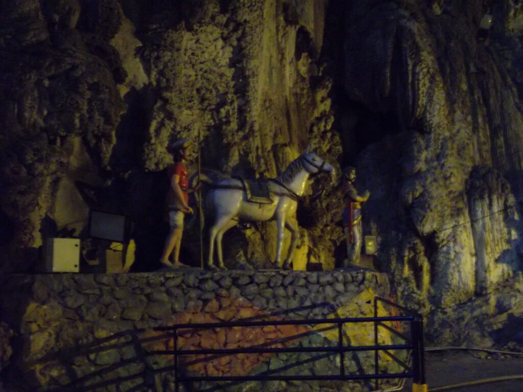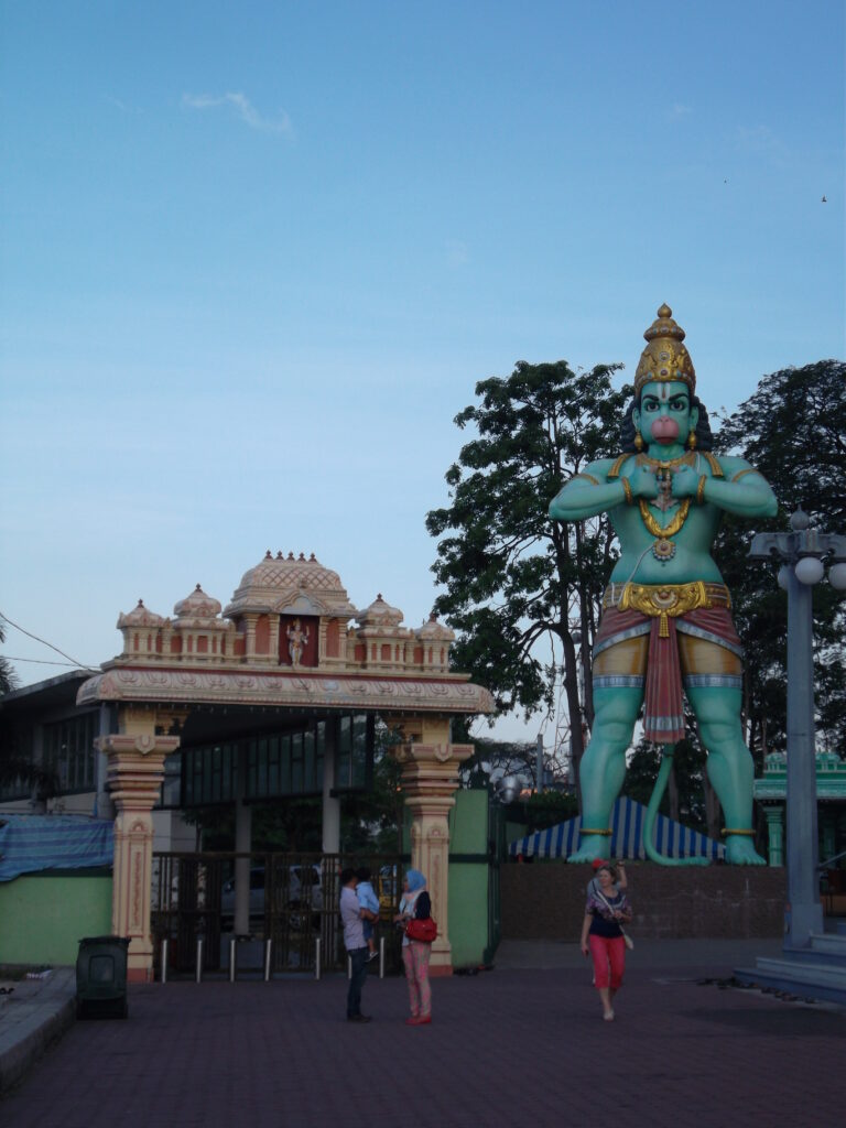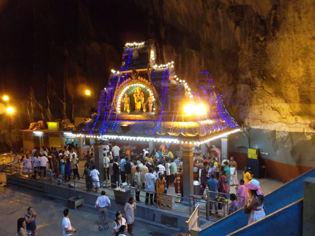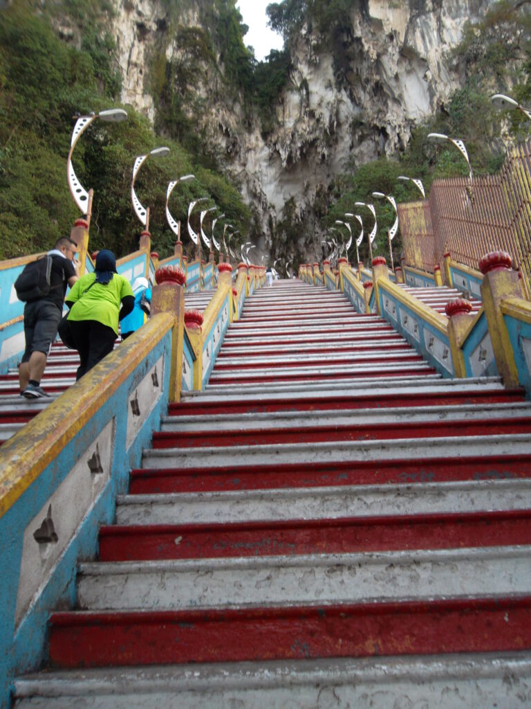 KTM Komuter-nya sepi, karena weekend mungkin ya. Trus tempat duduknya ada busanya gitu. Nyamanlah pokoknya. Perjalanan ke Batu Caves yang merupakan stasiun terakhir memakan waktu kurang lebih 1 jam. Dari stasiun, tinggal nyeberang sampe deh ke gerbang Batu Caves. Di dekat situ ada patung Hanoman raksasa. Terus ada kuil yang kebetulan waktu itu lagi ada acara. Jalan masuk terus, nanti kelihatan patung Murugan emas yang tingginya 42.7 meter itu. Di depan situ juga banyak burung-burung beterbangan. Oh iya, masuk ke Batu Caves ini gratis sodara-sodara. Jujur ya saya mau ke tempat ini udah lama gara-gara waktu itu nonton minidramanya abang pilipin yang salah satu lokasi syutingnya adalah disini. Hahaha. Nggak buang-buang waktu, saya pun naik ke guanya. Jadi, menuju gua-nya itu kita mesti naik 272 anak tangga. Lumayanlah bikin dengkul kliyengan. Di tangga itu, kita bakal menemui monyet yang lalu lalang. Tenang aja, asalkan kita nggak bawa makanan yang mencolok mereka nggak bakal nggangguin kok. Sampai di mulut gua, rasanya… capek banget. Haha. Saya sempat melihat mas-mas india yang langsung sujud begitu sampai di tangga paling atas. Mas-mas itu juga langsung sembahyang di kuil yang ada di mulut gua. Mau ngefoto tapi nggak enakeun takut ketauan, jadinya fotonya blur deh. 😛