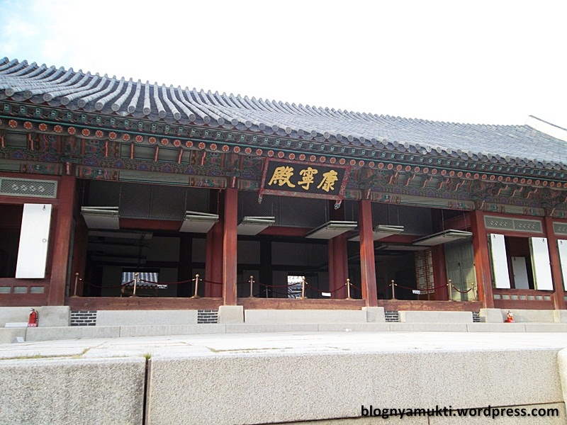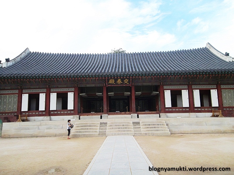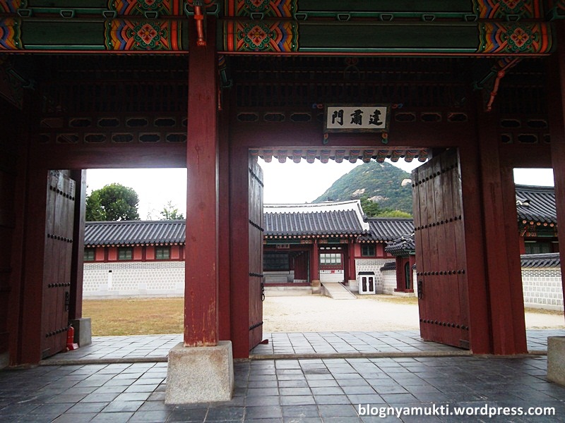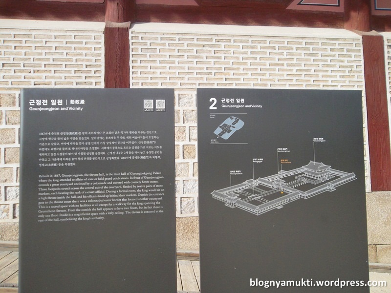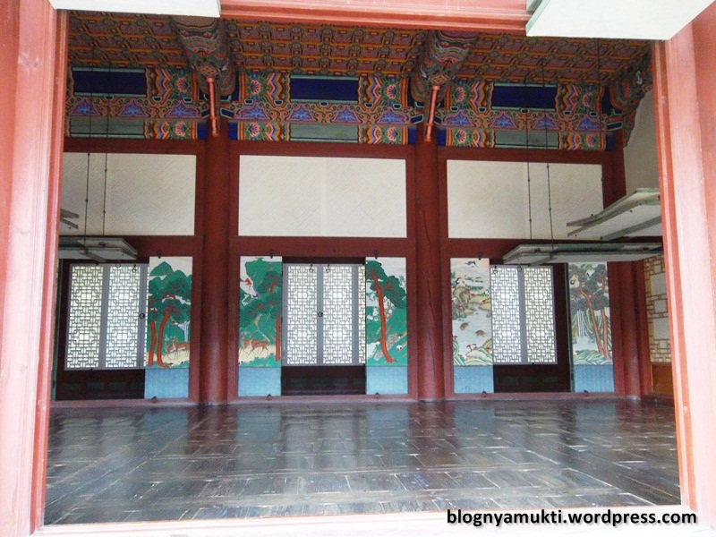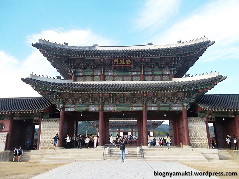 Gyeongbokgung has so many buildings, but I’ll just mention several buildings that you shouldn’t miss if you come here. One of the most popular building is Gyeonghoeru. It is a hall used to hold important and special state banquets during the Joseon Dynasty. The first Gyeonghoeru was constructed in 1412, the 12th year of the reign of King Taejong, but was burned down during the Japanese invasions of Korea in 1592. The present building was constructed in 1867 (the 4th year of the reign of King Gojong) on an island of an artificial, rectangular lake that is 128 m wide and 113 m across. I saw so many people taking photo with the hall and the lake as the background. You should do that too. 😉