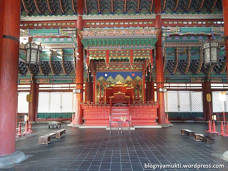 After entering Gwanghwamun gate, you’ll see another gate inside. This gate is called Heungnyemun, the entrance to the main throne hall called Geunjeongjeon. You’ll see a bridge when you enter this gate. I’ve mentioned about it before, all palaces have this small bridge near the entrance. Crossing the bridge means purify yourself. Between Heungnyemun and Geunjeongjeon, there’s another gate called Geunjeongmun. Geunjeongjeon has 2-layer roof that makes the hall appears to have two floors. Just like typical main throne hall, there’s throne and sun, moon, and 5 mountain background here.