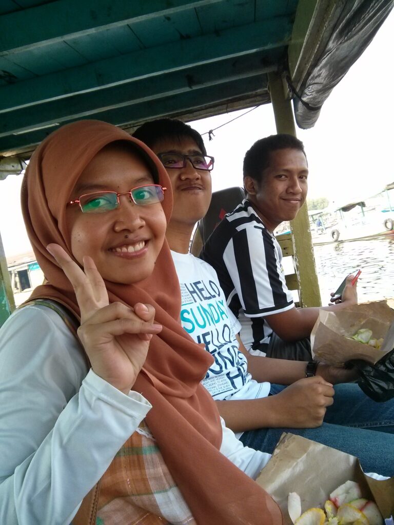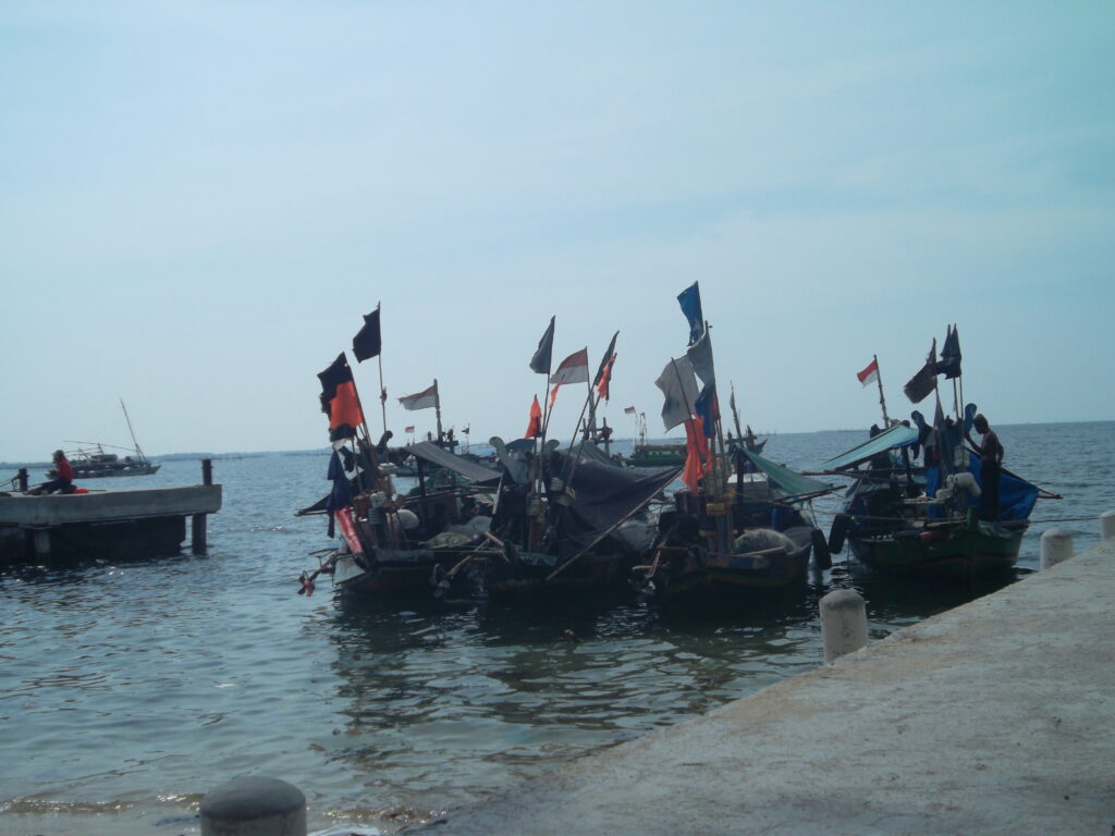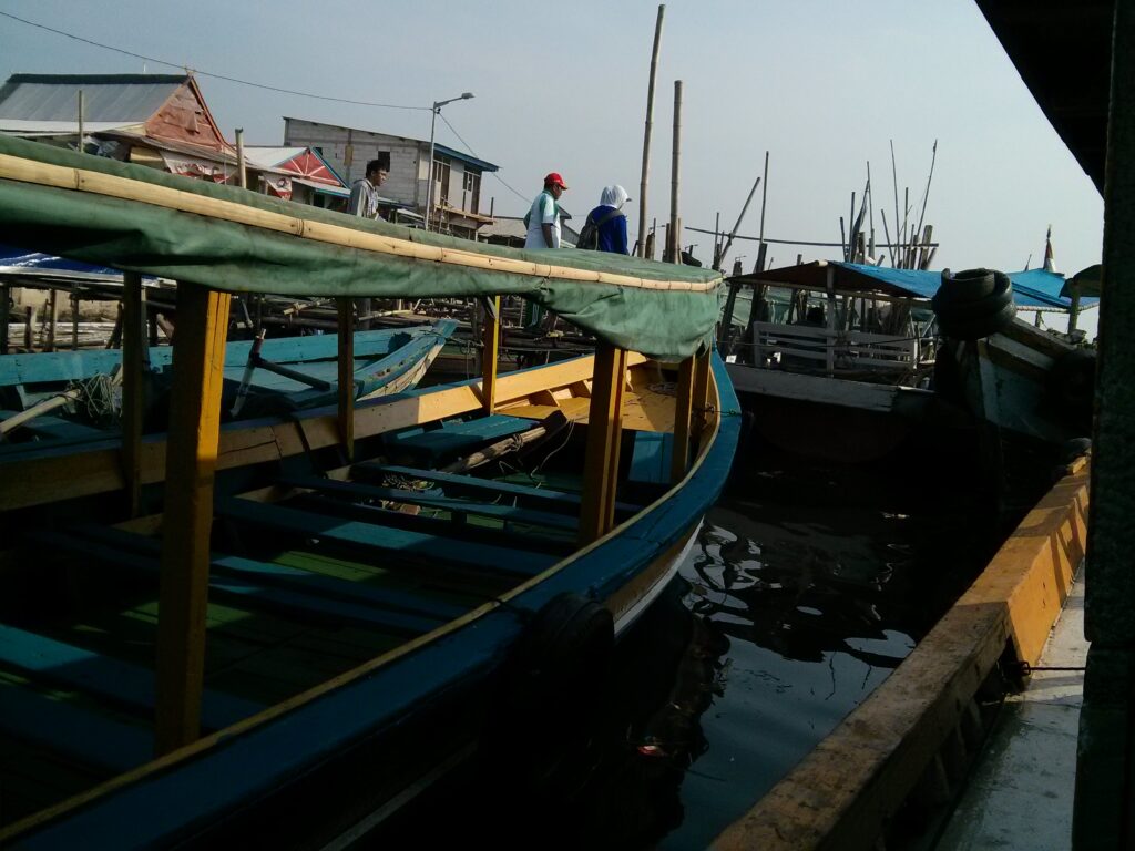 Pada hari-H, saya, ananti, apin, dan rizky berkumpul di halte dukuh atas untuk naik taksi ke Muara Kamal yang merupakan meeting point trip ini. Dari Sudirman ke Muara Kamal dan sempat nyasar sedikit, tarif taksi sekitar 120ribu. Kami turun di depan Pasar Ikan Muara Kamal dan kemudian berjalan ke arah pelabuhan untuk mencari tour leader dari pihak Shine Tour & Travel sebagai penyelenggara. Kami menelepon mbak Pipih yang sehari sebelumnya menghubungi saya lewat sms memberitahukan bahwa dia yang akan menjadi tour leader. Ternyata peserta tour kali ini cukup banyak dan ada beberapa tour leader di sekitar kami. Kami sempat tebak-tebakan mana yang mbak Pipih. Haha. Dan ternyata benar, mbak Pipih adalah salah satu tour leader yang ada di situ. Setelah ketemu dengan mbaknya, kami ditanya, apakah mau menunggu disitu atau langsung ke kapal. Kami pun memilih ke kapal saja. Mbak pipih kemudian mengantar kami ke kapal. Agak serem pas mau naik ke kapal ternyata jembatannya adalah jembatan bambu kecil. Selain itu untuk mencapai kapal, kami perlu melewati kapal lain. Setelah menunggu 1 jam lebih, termasuk menunggu 1 peserta tour yang datang terlambat tapi nggak mau ditinggal, kami pun berangkat.