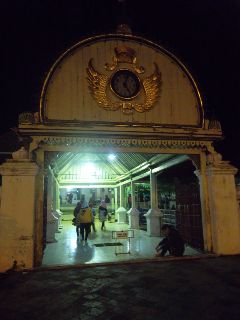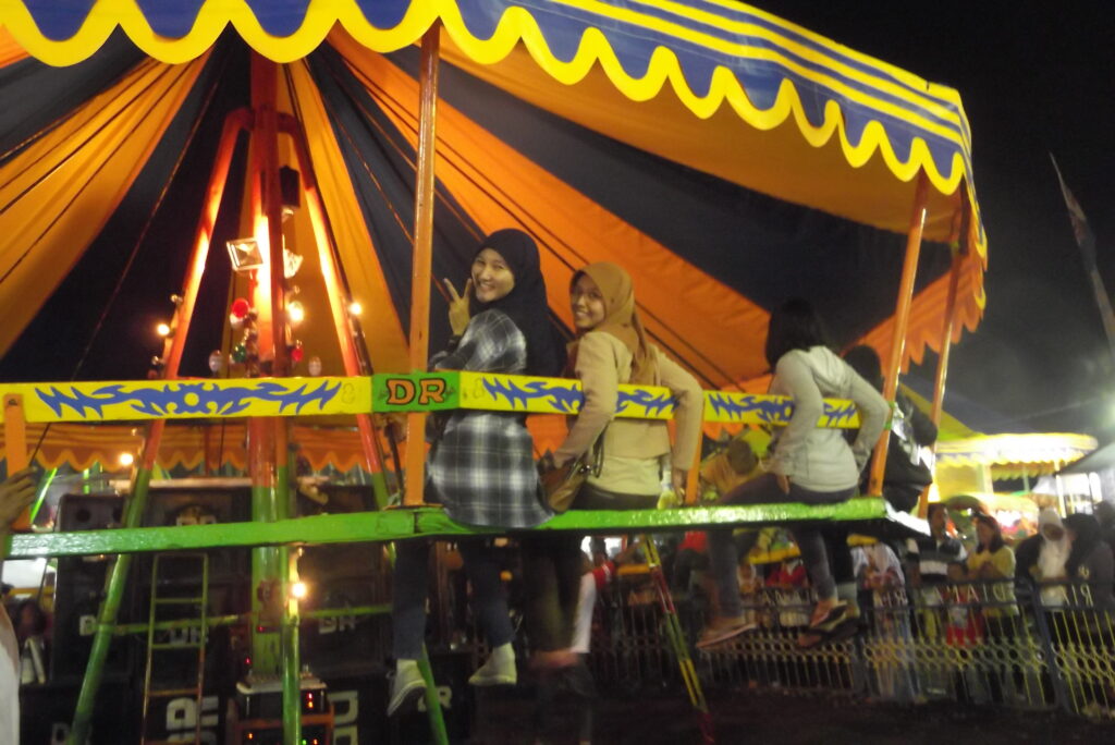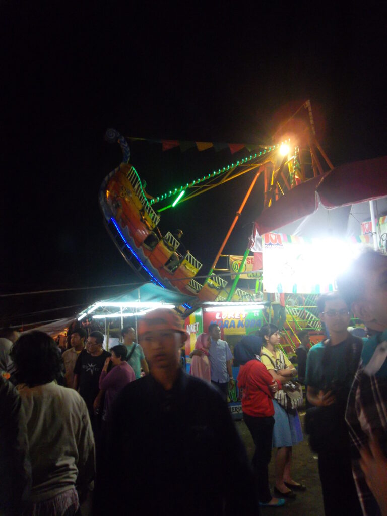 Selesai makan, kami pun meluncur ke arah alun-alun utara. Kami sholat maghrib di Masjid Gedhe Kauman. Suasana alun-alun dan sekitarnya sangat ramai, apalagi saat itu ada sekaten. Saya kemudian ketemuan dengan Ananti & Gisca di sekitaran masjid. Setelah itu kami menyeberang ke area sekaten. Disana, ananti & gisca naik wahana ombak. Saya sih jadi penonton saja. Tapi kemudian setelah dibujuk-bujuk saya pun menyerah untuk ikut naik bianglala. Saya tidak terlalu takut dengan ketinggian, tapi saya sangat takut dengan kecepatan. Dan gara-gara itu setiap bianglala mulai berputar ke arah bawah, saya pun langsung merem untuk mengurangi rasa takut. Hahaha.