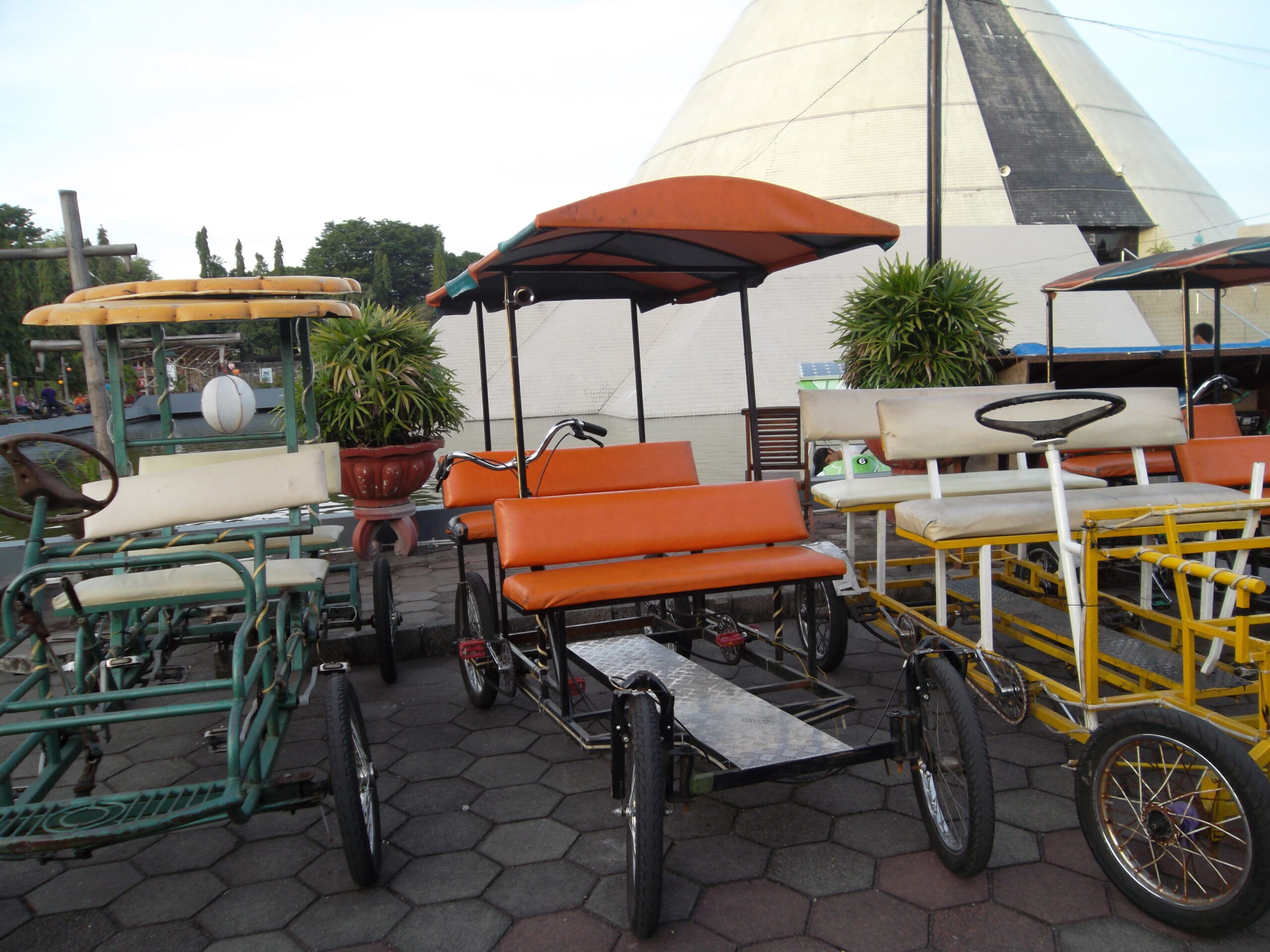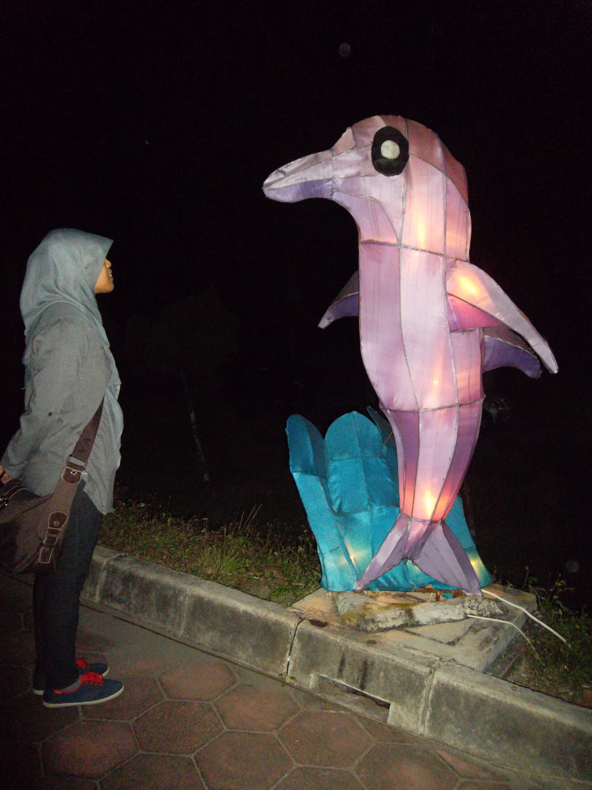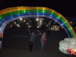 Setelah kekenyangan di Jejamuran, kami kemudian meluncur ke Taman Pelangi. Taman Pelangi ada di komplek yang sama dengan Monumen Jogja Kembali (Monjali). Tapi karena sudah sore, Monjali-nya sudah tutup. Kami pun duduk-duduk di sekitaran situ menunggu malam dan lampu-lampu dinyalakan. Taman Pelangi ini isinya lampu hias dengan berbagai bentuk. Bisa dibilang versi mini dari taman lampion yang ada di Batu Night Spectacular (BNS) Malang yang pernah saya kunjungi. Di taman pelangi ada penyewaan mainan seperti sepeda gandeng, becak-becakan, kereta-keretaan, bola air bahkan flying fox. Tapi disana kami cuma foto-foto saja.