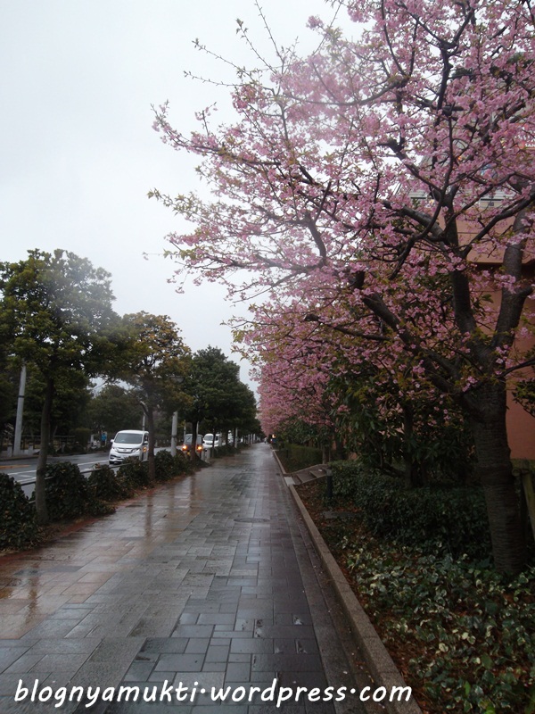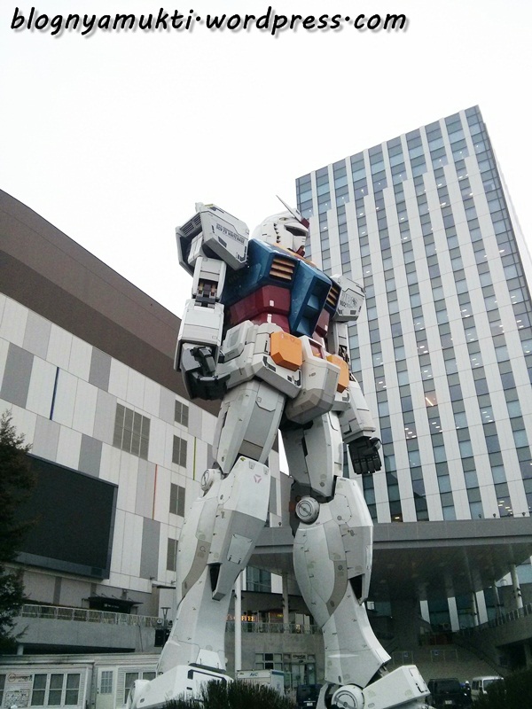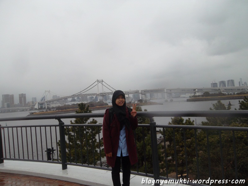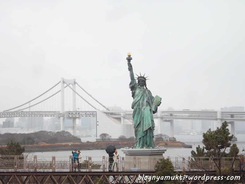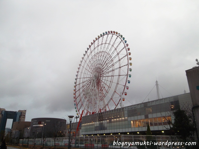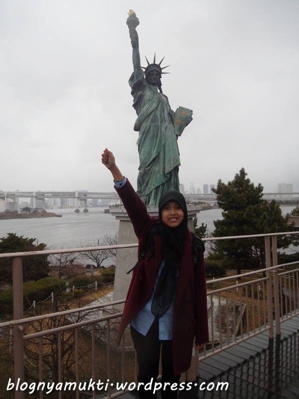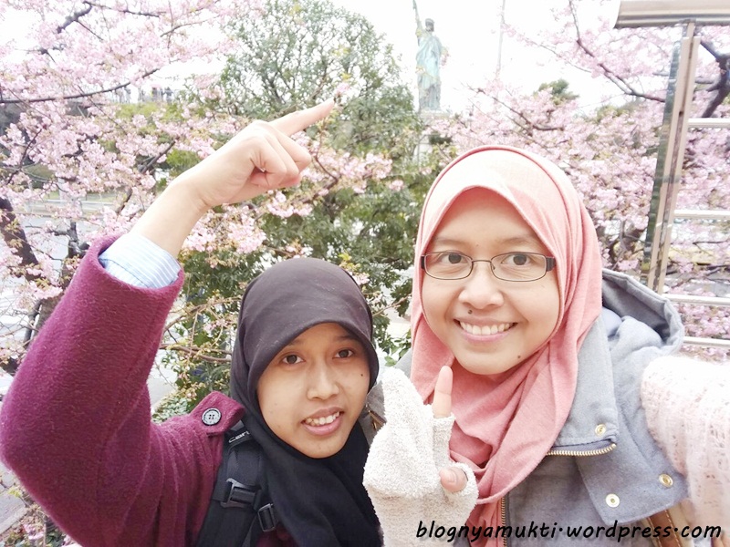 After that, we went to Odaiba. Ananti said there’s halal soba restaurant in Diver’s City. But when we arrived there, Diver’s City was closed. Huaa, we were so hungry. We then went to Aquacity and finally eat at Subway. LOL. I love and miss Subway sandwich, but it’s kinda funny that I eat Subway in Japan. Turned out the weather that day was kinda bad. It was raining so hard. And I put on wrong clothes. I didn’t use my heattech because It was hot the previous day. But that day, It was really cold. I took picture near the iconic Liberty statue in Odaiba. There was also a kind of sakura bloomed near Aquacity even though it’s not spring yet. We then walked to Diver’s City to see the big Gundam and then see ferris wheel nearby.