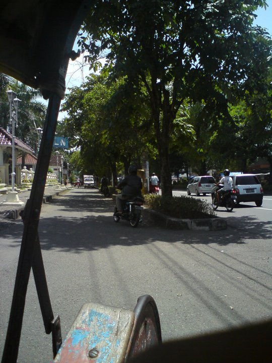 Setelah nunggu, teman saya pun datang ngejemput pake motor. Langsunglah kami menuju kosannya. Sholat dan istirahat. Kondisi saya pagi itu lumayan ngedrop. Pas bangun tidur di bis aja suara saya serak dan tenggorokan sakit gejala masuk angin. Mungkin karena kecapekan dan kemaren siangnya sempet minum es. Tapi karena nggak mau menyia-nyiakan kesempatan mumpung lagi di Jogja, saya pun menyehat-nyehatkan diri. Setelah Mutiara ngajar les, kami berangkat ke Malioboro. Di sana, kami sarapan pecel yang banyak ditemui di pinggir pasar Beringharjo. Saya makan pecel, mie, bacem tahu, dan bacem telor puyuh. Harga pecel ditambah mie atau lontongnya 6ribu, kalo pecel aja 5ribu, tahu 2ribu, sate telornya 3ribu. Lumayan murah meriah dan nyobain suasana baru. Hehehe..
