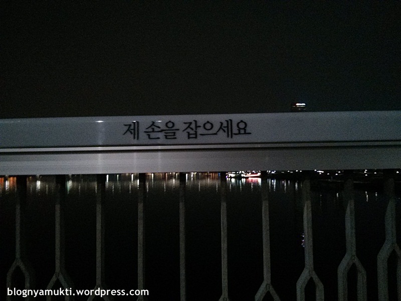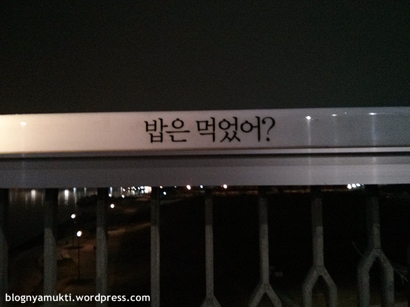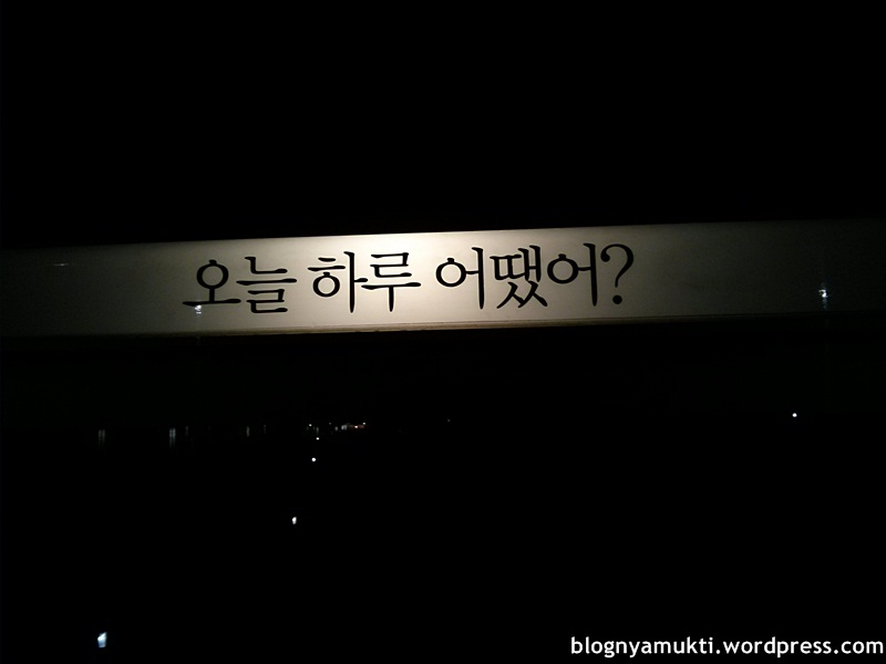 And several weeks ago, I did a night walk there. It’s quite nice reading the words. It felt like I have a friend during the walk. A super nice and caring friend. It started with “Did you eat?”, “Are you doing good?”, “The wind is nice”, “How’s your day, today?”, “It looks like hard”, “I know even though you don’t tell me” and so on. There are some funny questions like “Do you like jjajjangmyeon (black bean noodles)? If not… Do you like jjampong (seafood noodles)?” and several food names and photos. Some made you think about your problem. Your life is like a movie and it’s not the end yet. Think about your family, friends, your loved ones. And some words are kind of mellow like “Open your heart”, “Hold my hand”, “You are not alone”.
