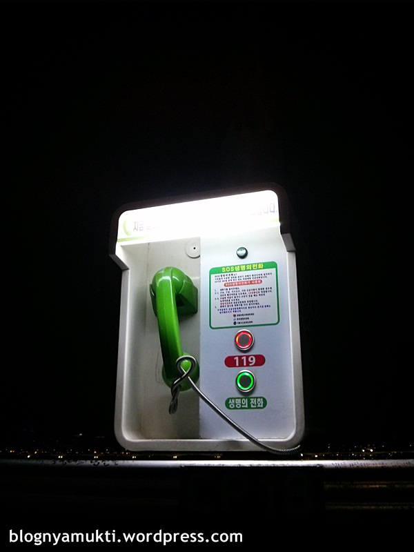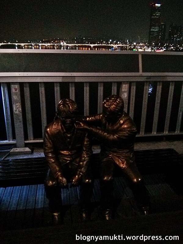 I also saw 2 SOS phones. There are 2 buttons on these phones, green button to call 119 (like 911 in US) and red button to call suicide hotline. At the middle of bridge, there’s statue of 2 friends. One of them pinches the other’s cheek. The project had super nice intention. Even though a report mentions that the number of people who attempted suicide on this bridge a year after the project finished actually increased. And up until now, I still find news about suicide attempt on Mapo Bridge.
