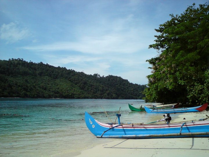 Sorenya, kami pun naik jukung untuk snorkelling. Satu jukung isinya 5 orang. Nah, karena nggak ada yang nyewain alat snorkelling sebaiknya kalo mau kesini bawa alat sendiri deh. Tapi kalo life jacket sih ada yang nyewain. Kalo nggak bisa ngusahain alat snorkel, coba aja pake kaca mata renang biasa dan jangan lupa sandal travelling (sandal yang ada talinya, biar nggak copot dan kaki nggak terluka kena terumbu karang). Kerennn.. Sayangnya saya nggak jago snorkelan, jadinya cuma ngeliat ke bawah sebentar, terus gelantungan di jukung aja. Huhuhu, sayang banget.. Tapi, emang keren deh.. Apalagi buat saya yang sebelumnya belum pernah snorkelling. (blush) Oiya, airnya jernih banget, dari atas pun sebenernya udah lumayan keliatan terumbu karangnya. Tapi sayangnya, ada beberapa spot yang kotor karena sampah. Grrr.. Setelah beberapa lama snorkelling, kami pun menepi dan main-main di pantai pasir putihnya. Karena udah sore, ombaknya lagi pasang dan itu lumayan besar. Jadinya pada maen ombak deh. Hehehe..