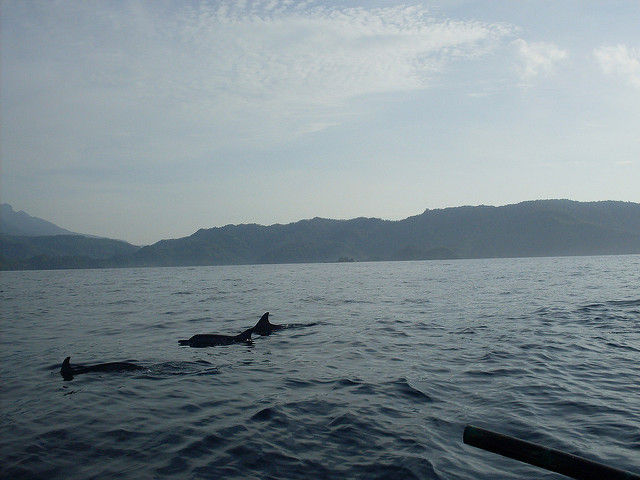 Paginya, sekitar jam setengah 6 kami sudah siap. Tapi baru naik jukungnya sekitar jam 6. Padahal, katanya sih waktu yang cocok untuk berangkat adalah jam 5 pagi. Tapi yasudahlah, yang penting nanti ketemu lumba-lumba. Hahaha.. Kali ini, penumpang jukung cuma 2 sampai 3 orang karena jukung bakal dibawa ke Samudera Hindia dan ngejer lumba-lumba. Jadi, kalo penumpang kebanyakan ntar pengemudinya kesusahan. Deg-degan banget pas jukung mulai masuk ke Samudera Hindia. Bayangin aja perahu sekecil itu di tengah Samudera yang entah dimana ujungnya. Huaa, ngeri dehh.. Tapi pas udah agak lama dan kelihatan jukung-jukung lain yang sama-sama lagi ngejer lumba-lumba, deg-degannya lumayan berkurang. Apalai pas ngeliat lumab-lumba pertama lewat. Huaa, girangnya bukan main.. Mas pengemudi jukung dengan lincah mengarahkan jukung ke dekat lumba-lumba supaya kami bisa melihat lumba-lumba lebih dekat. Berkali-kali begitu. Kadang-kadang si mas pengemudi jukung mengeluarkan bunyi mirip peluit untuk memancing lumba-lumba supaya mendekat. Huaa, bener-bener seru deh..