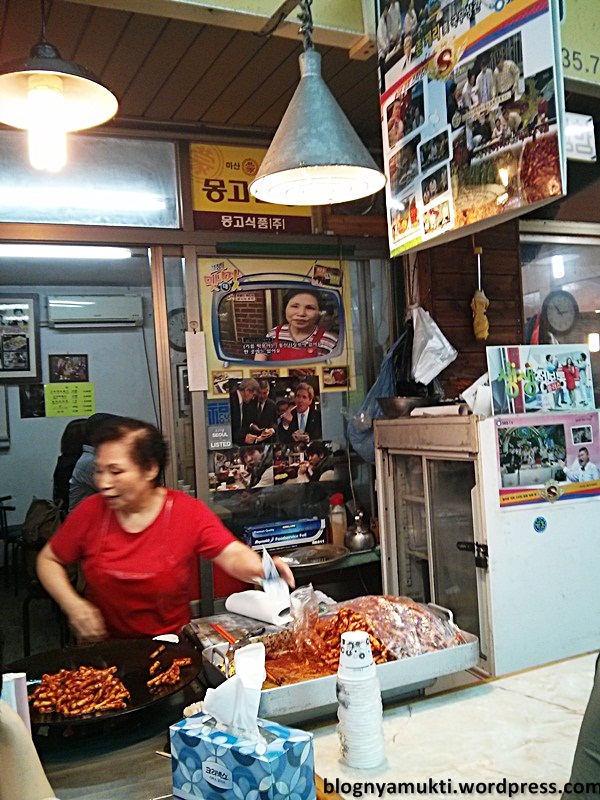 I recommend you the old style ddeokbokki. You won’t find the usual ddeokbokki with gochujang sauce here. The ddeokbokki will be fried in a wok with some red pepper. The seller put so many pictures of Kang Hodong and Lee Seunggi from 1N2D when they visited the shop.