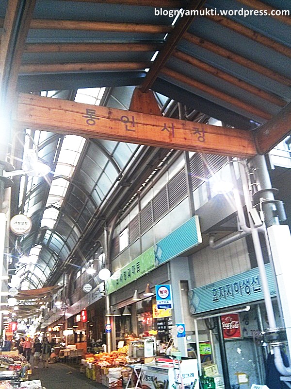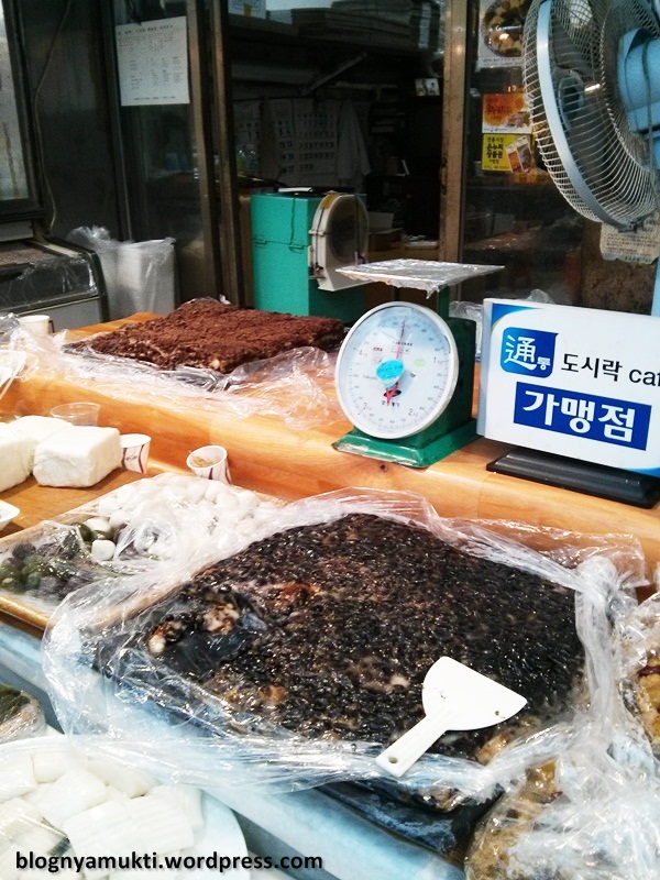 There are a lot of food choices there. There are mandu (dumpling), meat, kimbab, jeon, pickled vegetables, etc. If you don’t have any dietary restrictions, this place will be a heaven. But for me who can’t eat meat, it’s kinda difficult. But, I was lucky that I met a very kind seller. When I told her that I don’t eat meat, she helped me choosing the food. I bought small crab in pepper paste, vegetables salad, and egg from her. And she gave me tofu as service (bonus). I think I’ll buy from her again when I visit Tongin Market next time. 😛 Her shop is not far from the Customer Center where the Dosirak Cafe located. Just go straight around 2-3 shops, it’s located on the left side (Dosirak Cafe is on the right side).