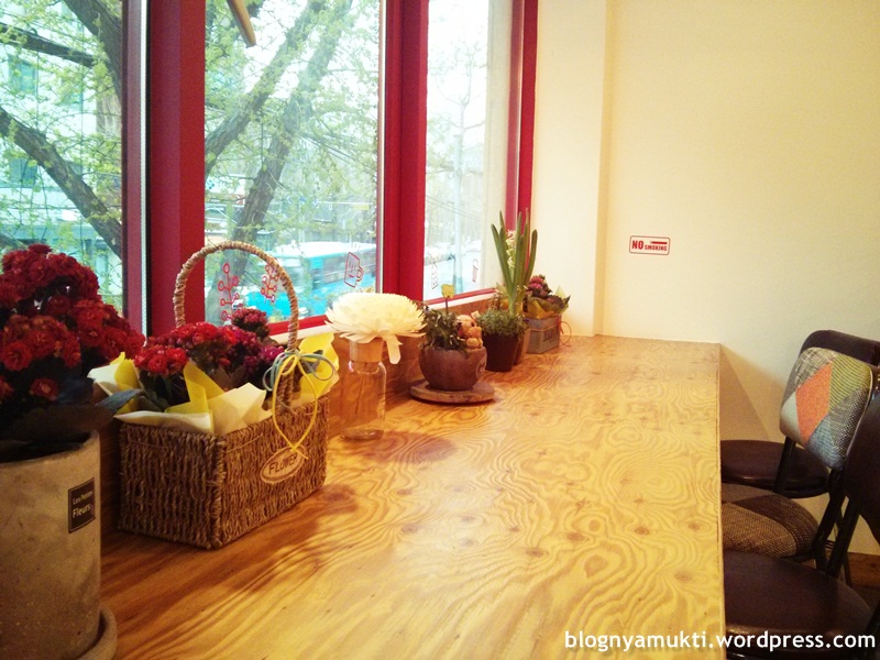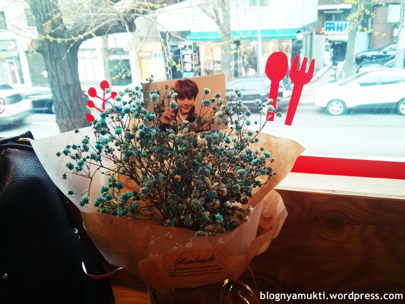 I love the interior design, it’s cute but warm. It’s adorable that they put yoseob’s photo on the flower. 꽃미남, eh? kkkk. I  sat at a chair near the windows, the tree outside makes the view feel so lovely. I also loved the songs played there.